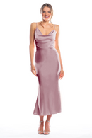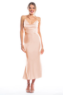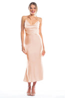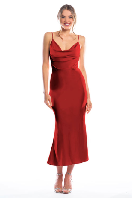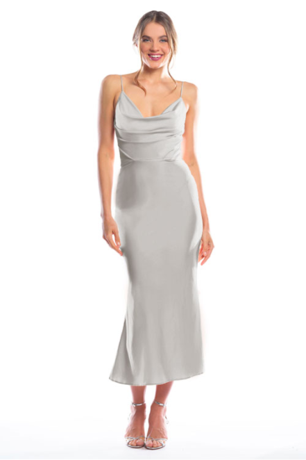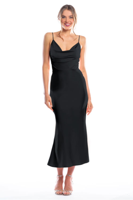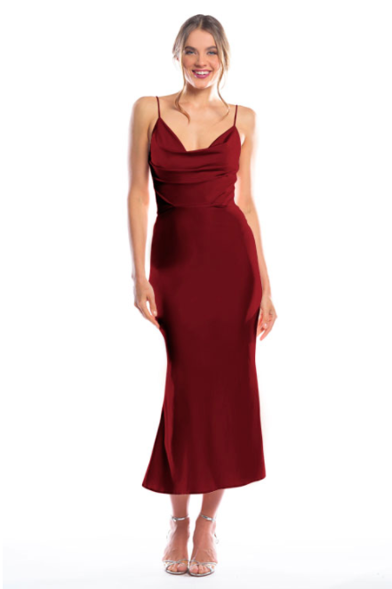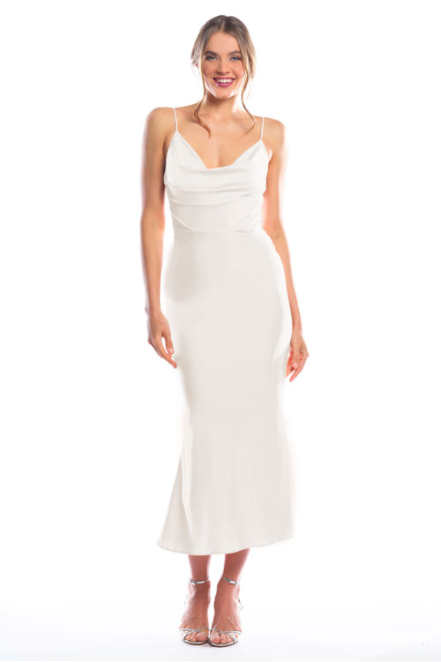 Spaghetti strap cowl neck bodice with a slim-fit midi-length skirt.