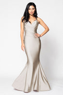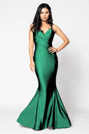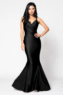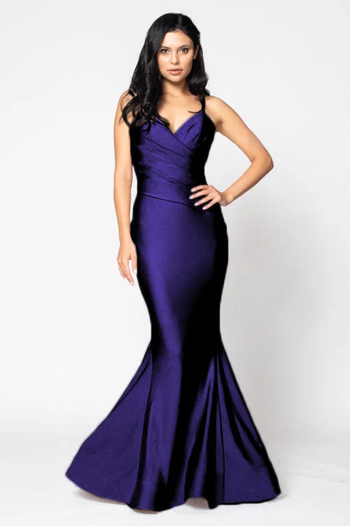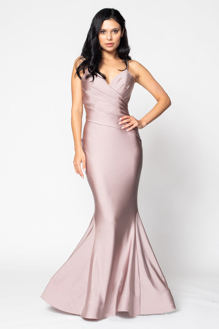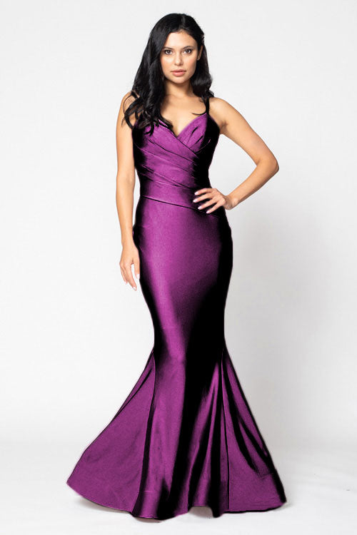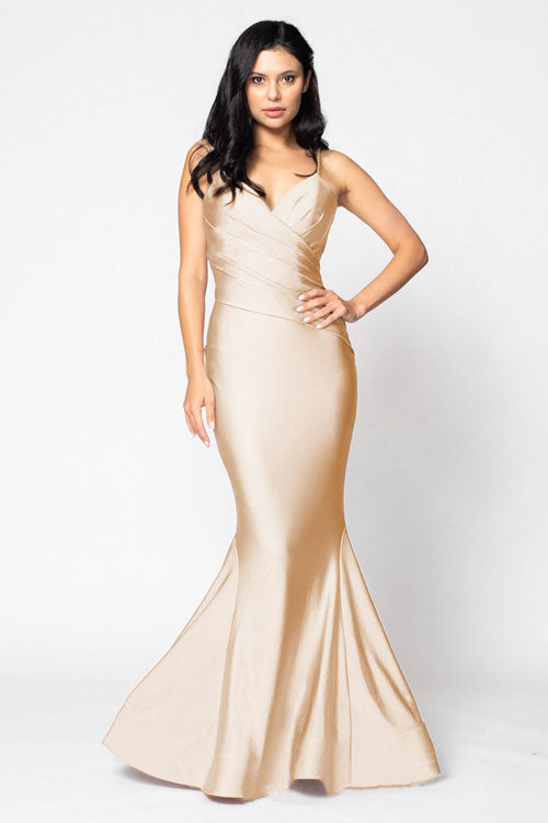V-neck spaghetti strap with diagonal pleated. Mermaid skirt with horsehair trim.