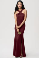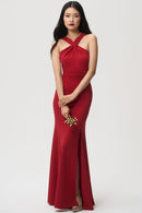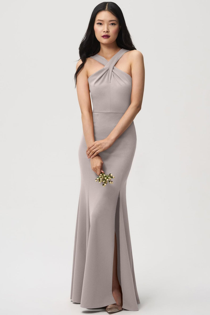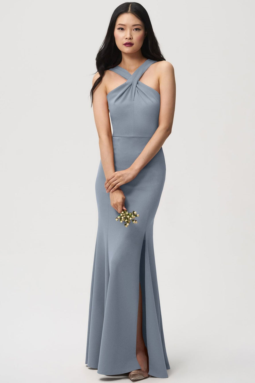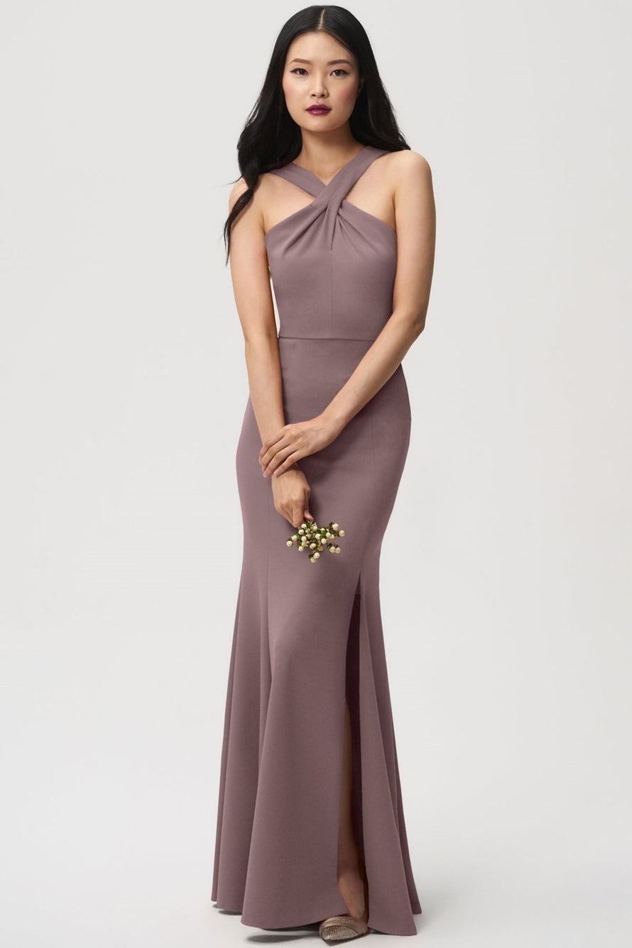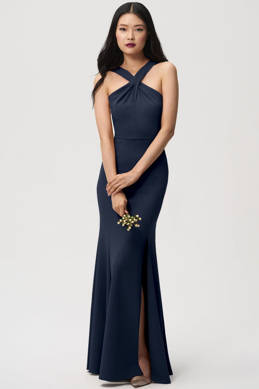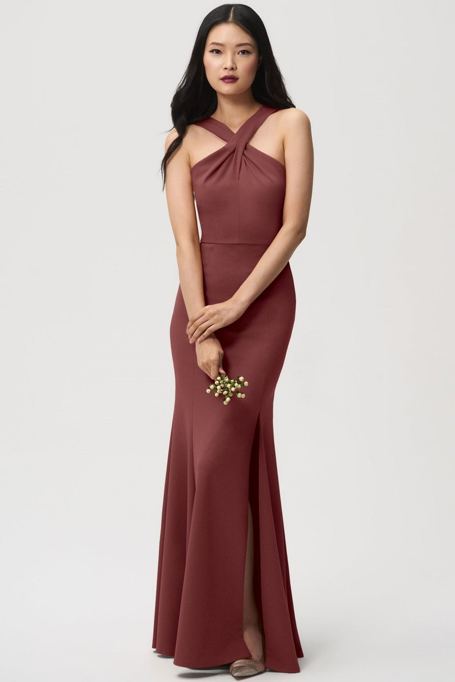 The Kayleigh bridesmaid dress, crafted in a comfortable knit crepe, boasts an elegant cross-front neckline and a flattering fit-and-flare skirt that accentuates your curves. It adds touches of allure with a tasteful side slit and stylish criss cross straps in the back.