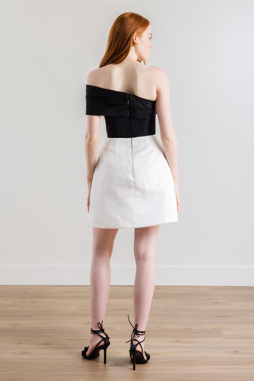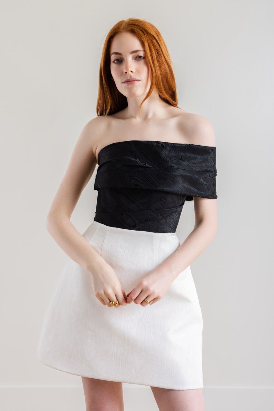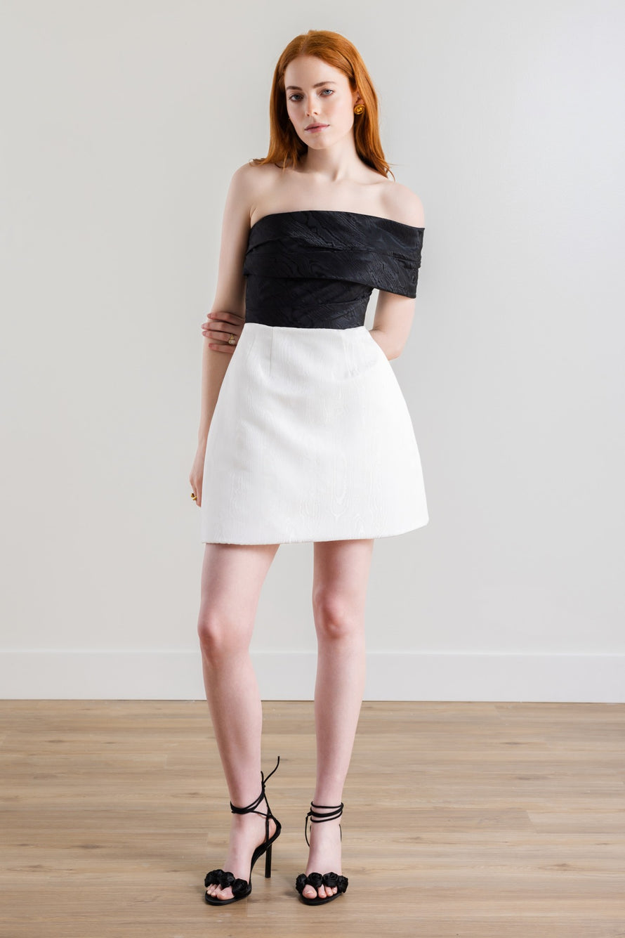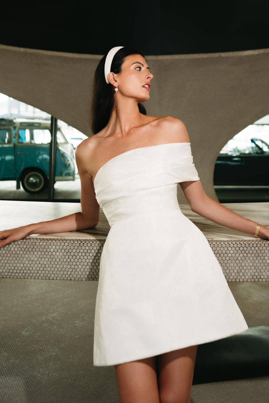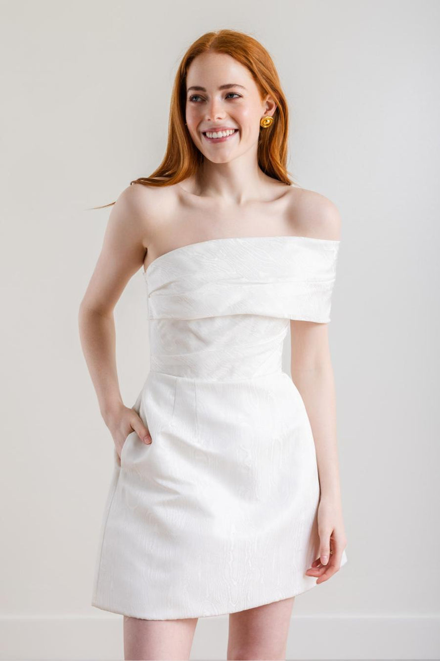 True to her name, Pretzel twists across the bodice and arm in this chic asymmetrical off-the-shoulder style. Inspired by our own Sydney Watter's rehearsal dinner look, the Moiré Jacquard adds a fresh new pattern and texture to the classic A-line silhouette. Try it in black for an unexpected color-blocking moment!