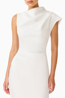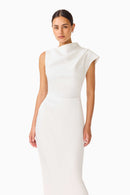 Step into a world of pristine elegance with the Coralie Maxi in a crisp, luminous White. This gown is the definition of modern bridal luxury, featuring a sophisticated high neckline and intricate body-draping that sculpts and enhances the silhouette with statuesque poise.