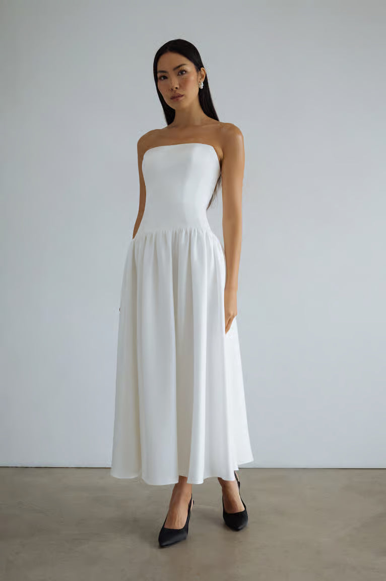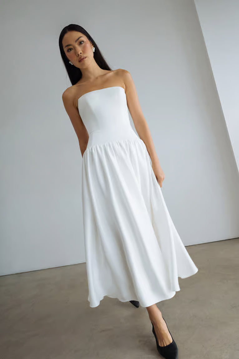 The Joanna dress, with her structured drop waist bodice and full flowing midi skirt is an effortlessly elegant option for any bridal event.