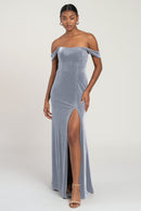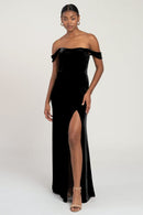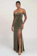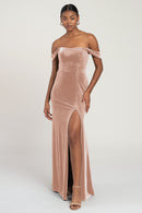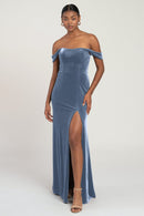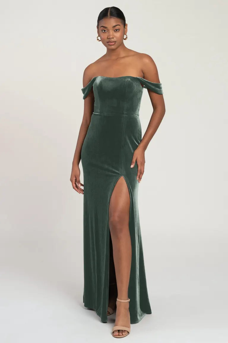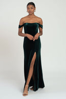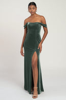 The Issa velvet off-the-shoulder bridesmaid dress adds an elegant touch to any bridal party. With its wide scoop neck gracefully transitioning into a flattering draped sleeve, it beautifully accentuates your shoulders, creating a striking and chic look.