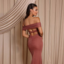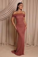 The Zoe Gown is made from stretch chiffon and features an off-shoulder neckline with layered detailing that drapes softly across the bust and arms. The fitted silhouette hugs the figure and flows into a subtle train, while the open back with crossover straps adds a modern touch. A sleek and romantic choice for bridesmaids.