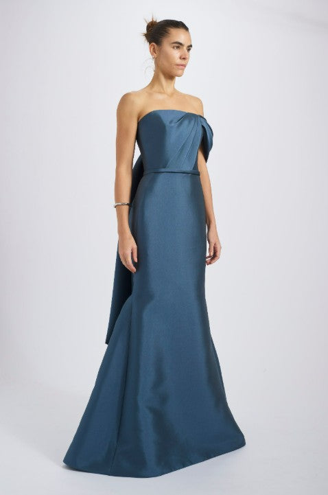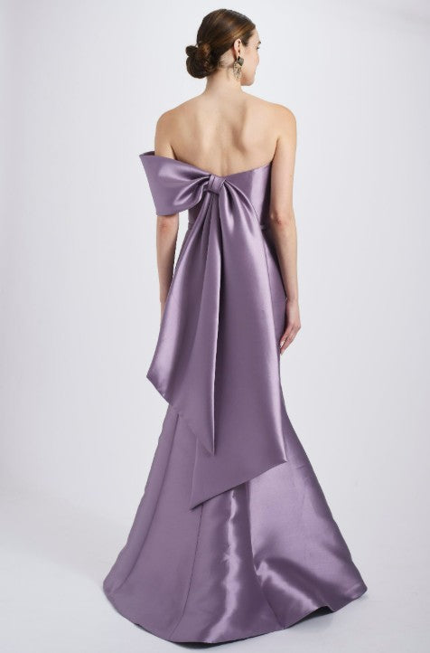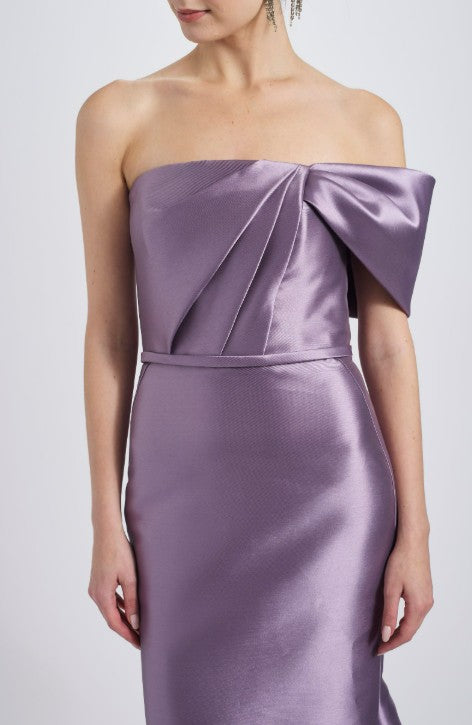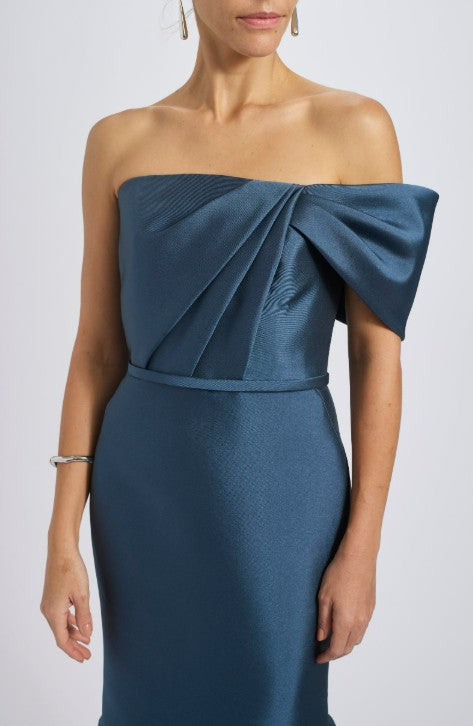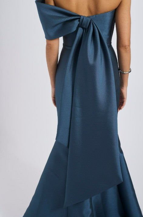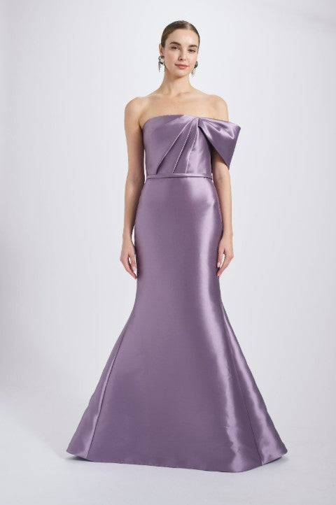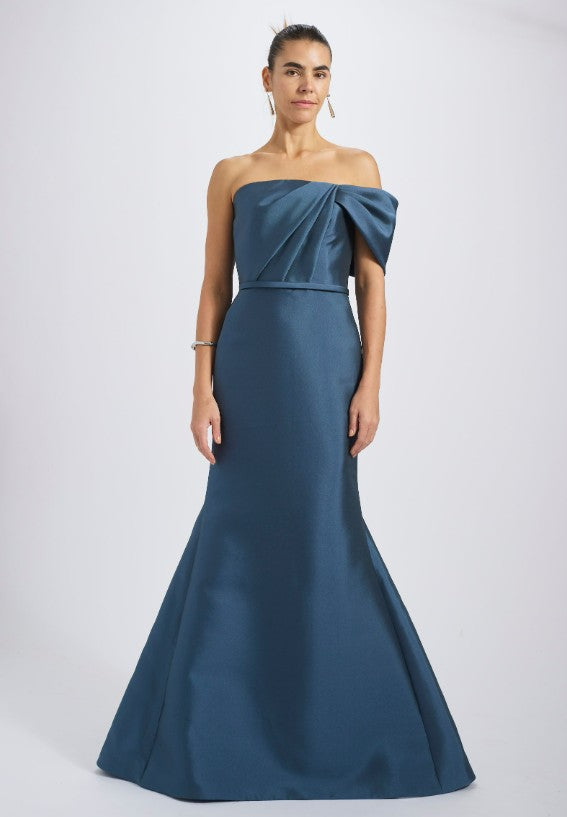 Mikado strapless asymmetric off-the-shoulder fit-to-flare gown with bow detail. Shown in Petrol & Violet.