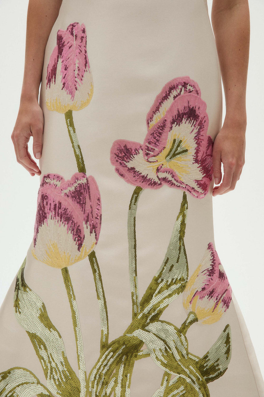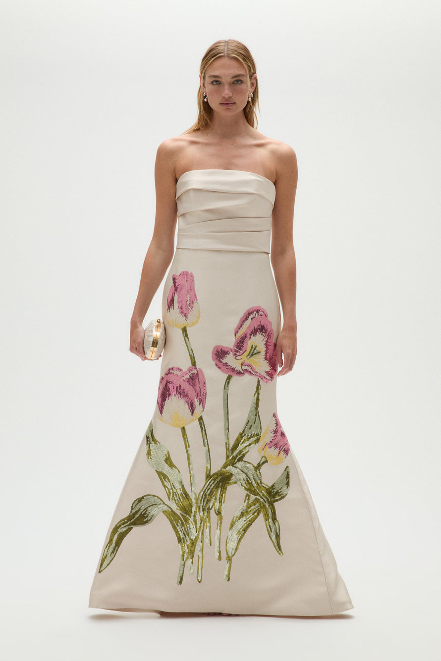 Mikado hand draped strapless fit-to-flare gown with oversized tulip sequin appliqué.