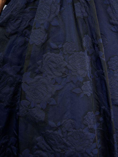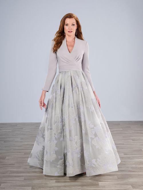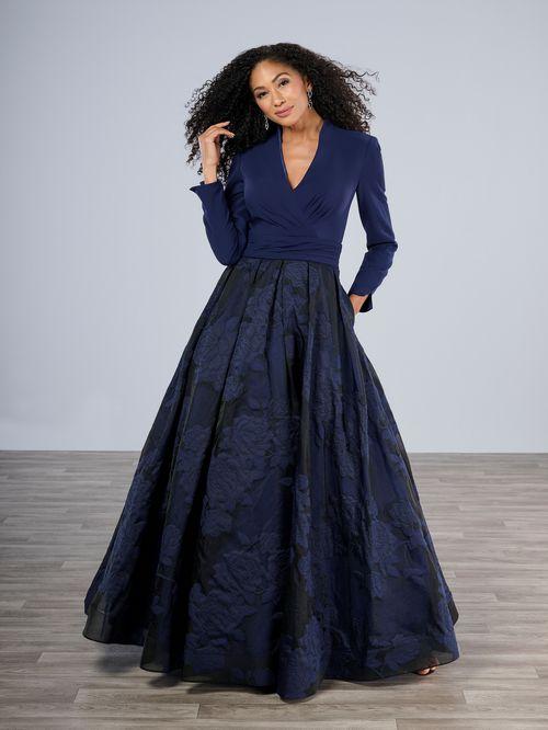 A-line gown in stretch satin on bodice and textured organza skirt. Slim V-neck with side draping on front bodice and pleated combo band on the waist. Long sleeves. Side skirt pockets.