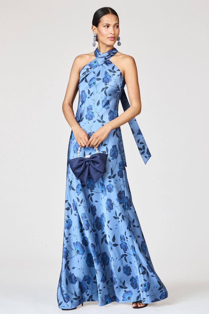 The Laurant is the definition of understated glamour. Designed with a sleek halter neckline that fastens softly at the back, it gives way to cascading tails that add fluidity and just the right hint of drama. The silhouette frames the face and highlights the collarbone, offering a modern, sophisticated take on sensuality. The body of the dress drapes like a dream, falling effortlessly at the hip.