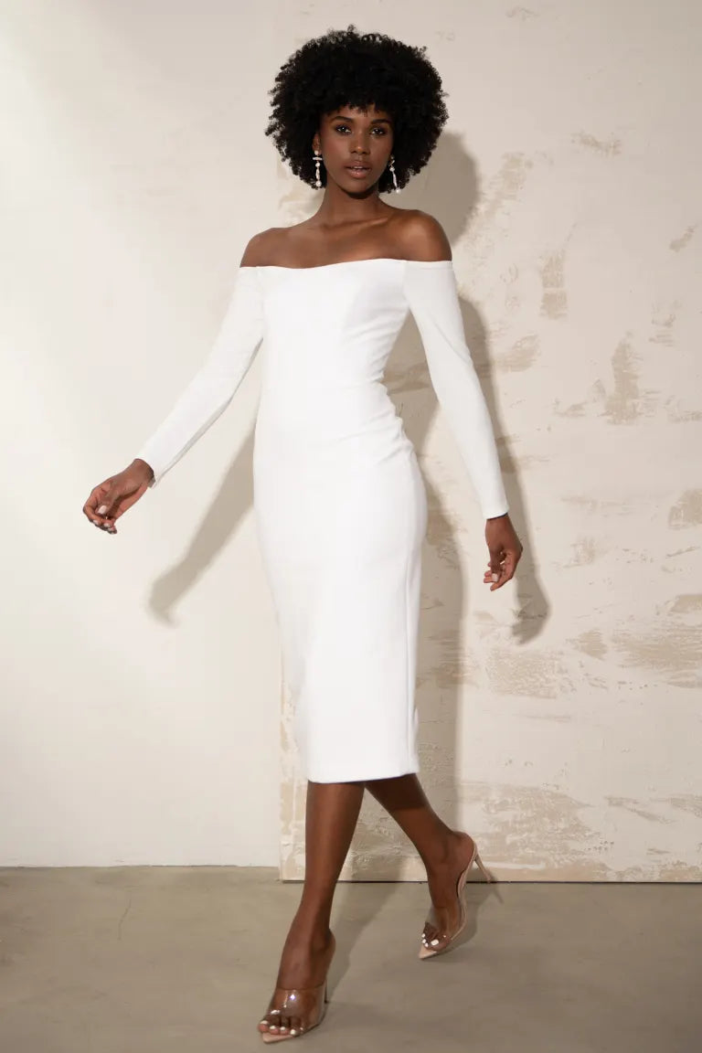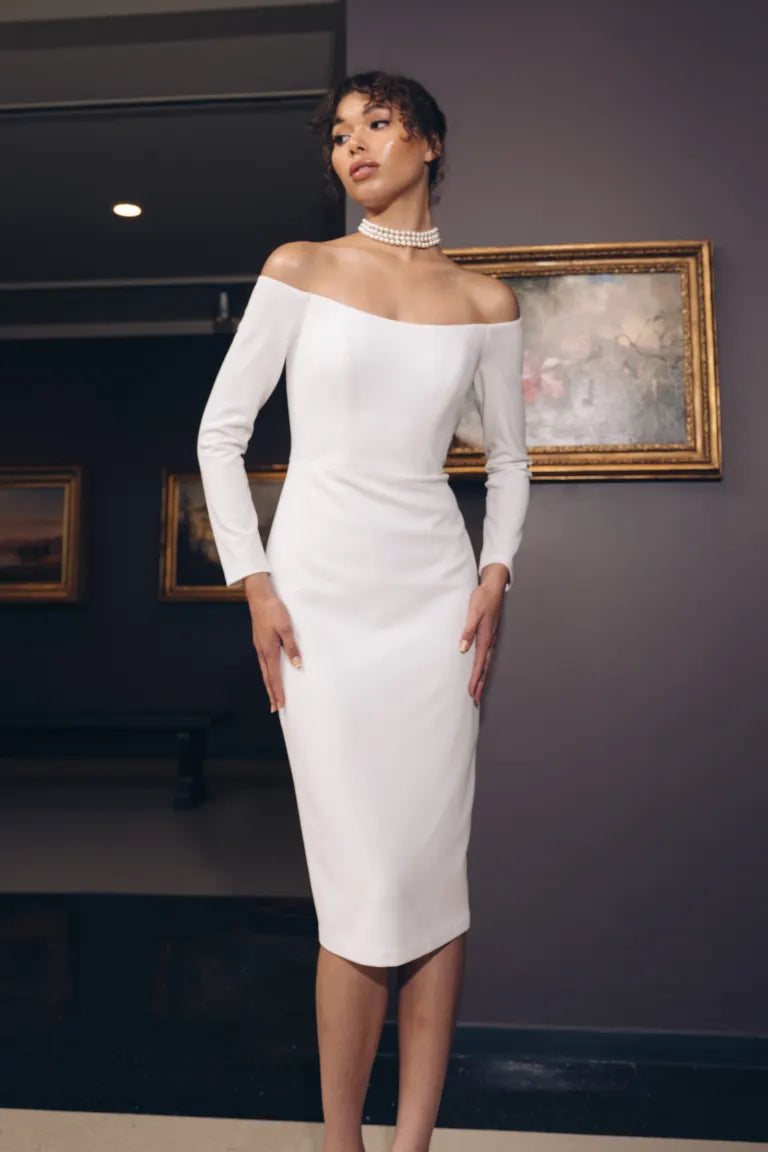 The Ayla dress exudes sophistication featuring a captivating off-the-shoulder neckline, gracefully slim, long sleeves and a pegged midi skirt with slit in the back. This chic and streamlined dress is perfect for various bridal occasions.