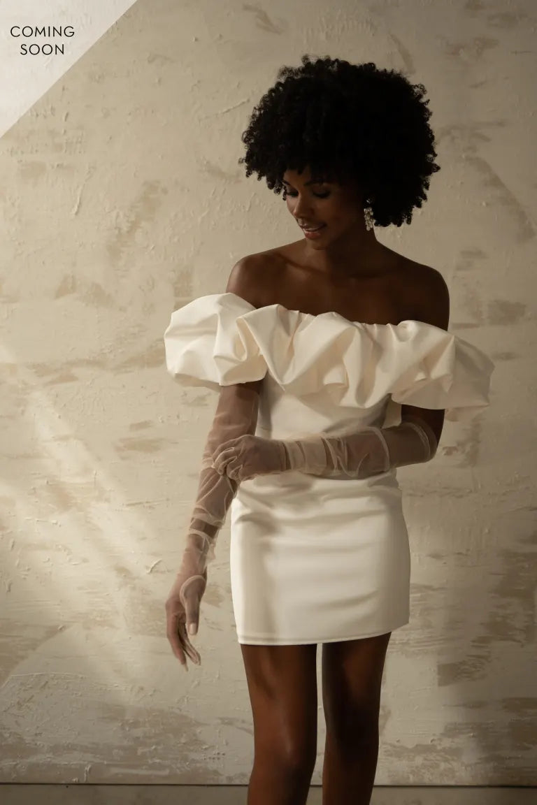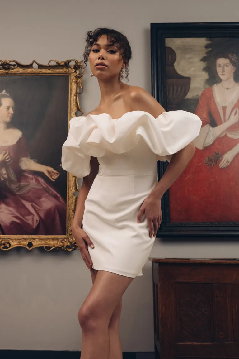 The Emily dress is a playful little white dress that features a beautifully sculptural ruffle on top followed by a fitted mini dress, it adds a chic and exciting touch to any of your bridal events. This stunning dress is sure to capture attention and turn heads!