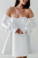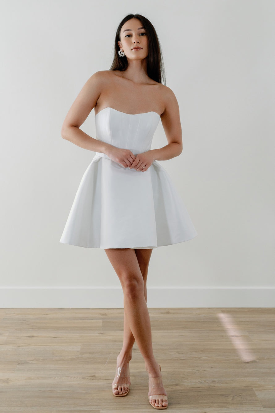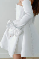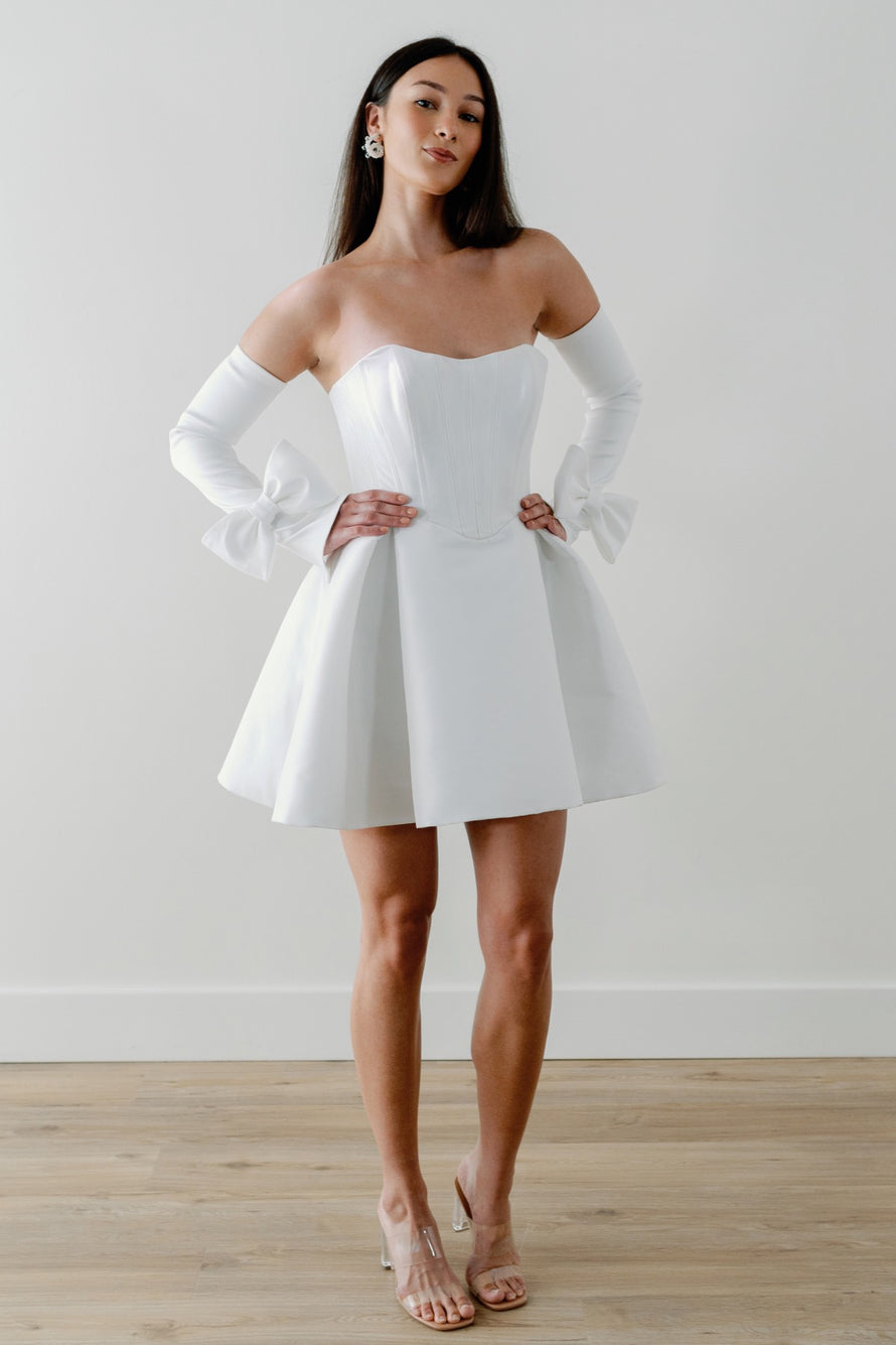 Effortlessly chic, Epic is a mini dress like no other. The structured corset bodice will keep you feeling comfortable and secure while you dance the night away. The extra long sleeves truly complete the look with their oversized bows and are fully removable so you can have two looks in one!