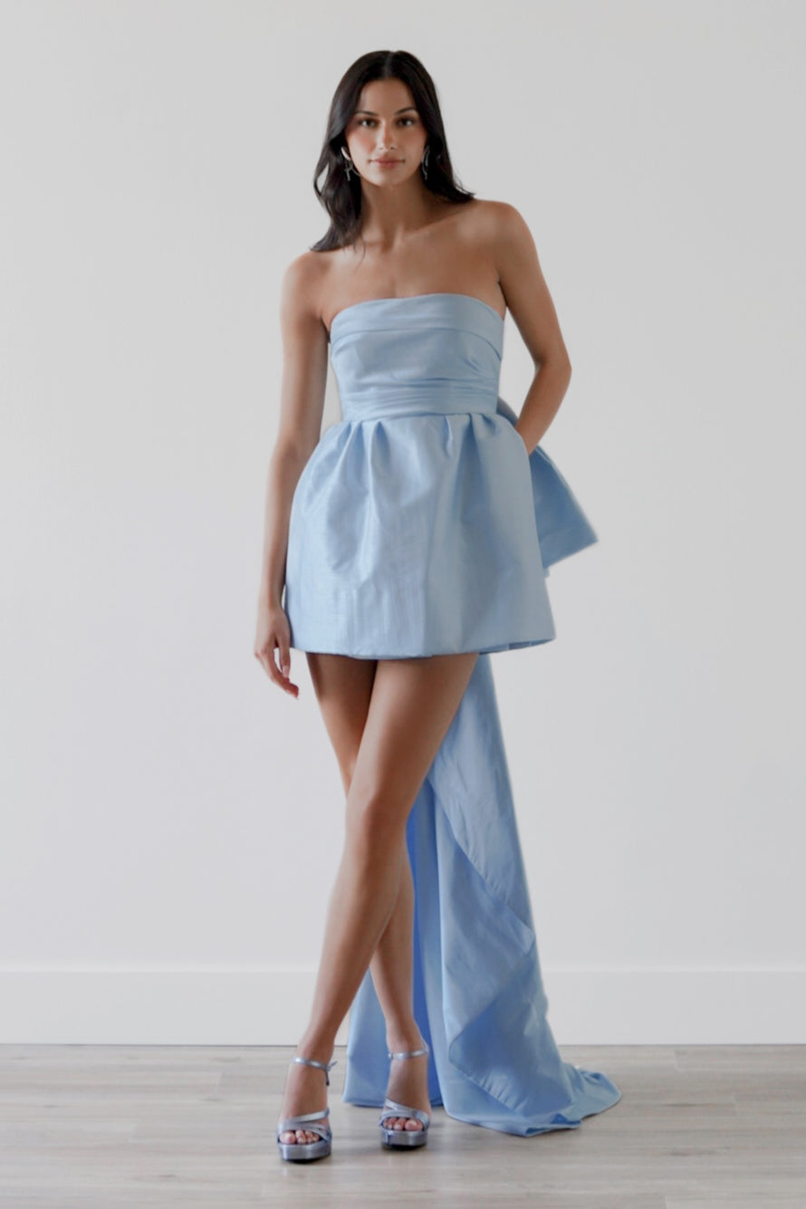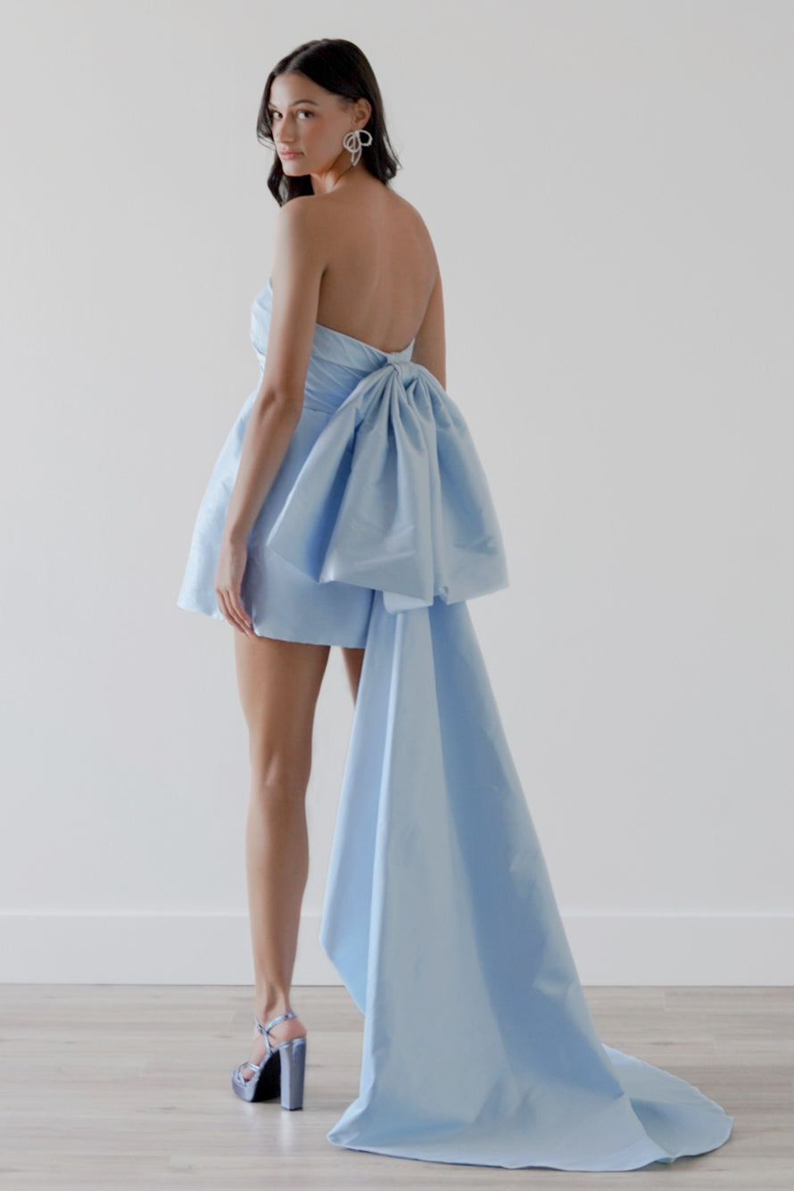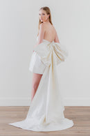 Drama and decadence, what more could you want in a little white dress? This perfectly polished mini is paired with an over-the-top bow, and it is removable for two looks in one.