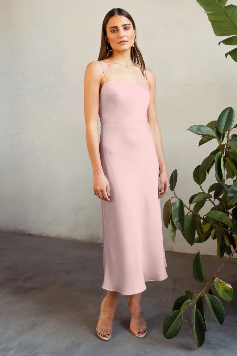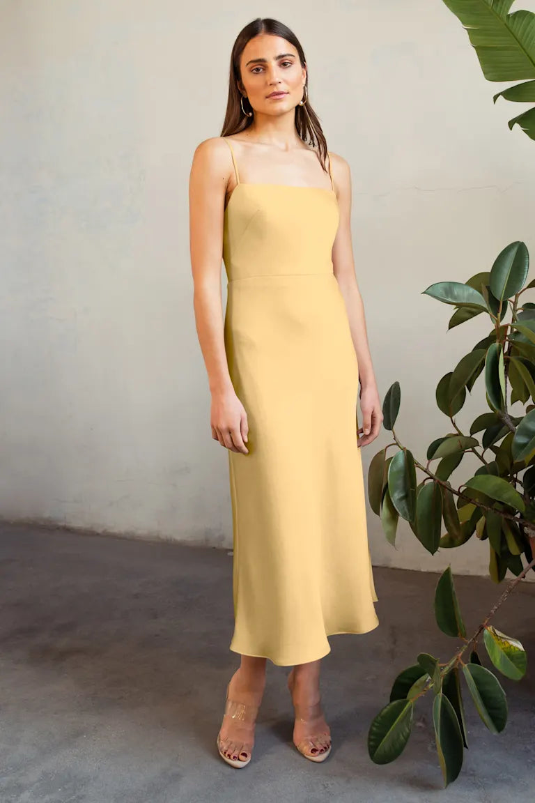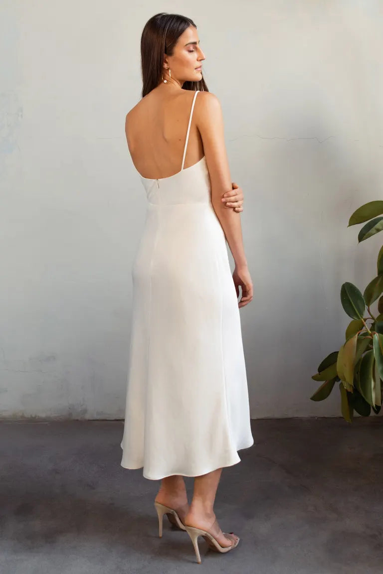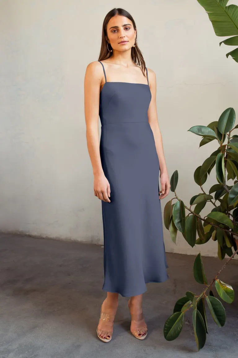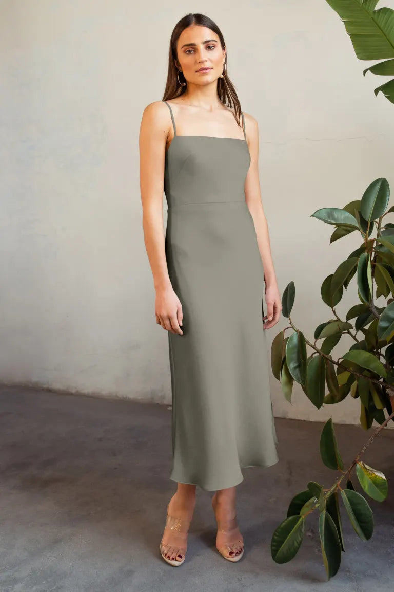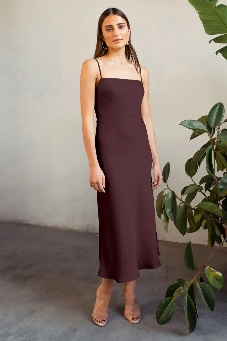 The Claudia satin midi dress offers a modern interpretation of the classic slip dress. It features delicate spaghetti straps, an elegant straight neckline, and a sleek bias-cut skirt for a contemporary and stylish appearance.