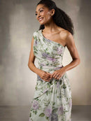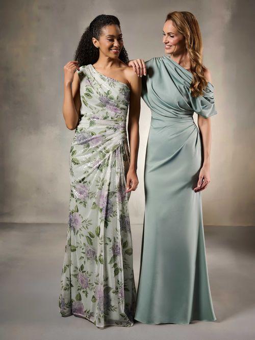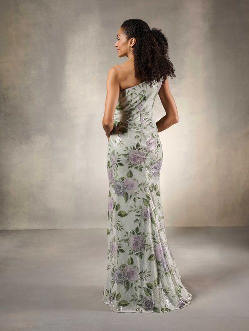 Slim style in sequins lace, with one shoulder and diagonal draping on the bodice, pleating on side front skirt.