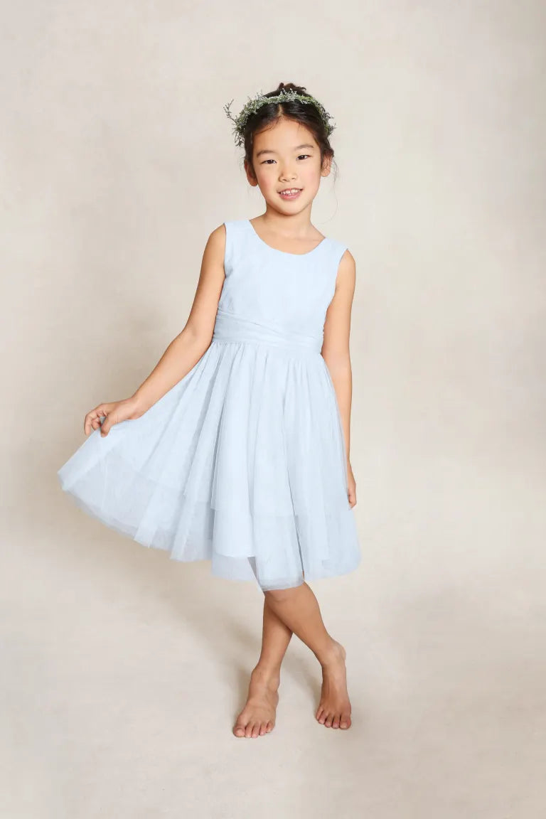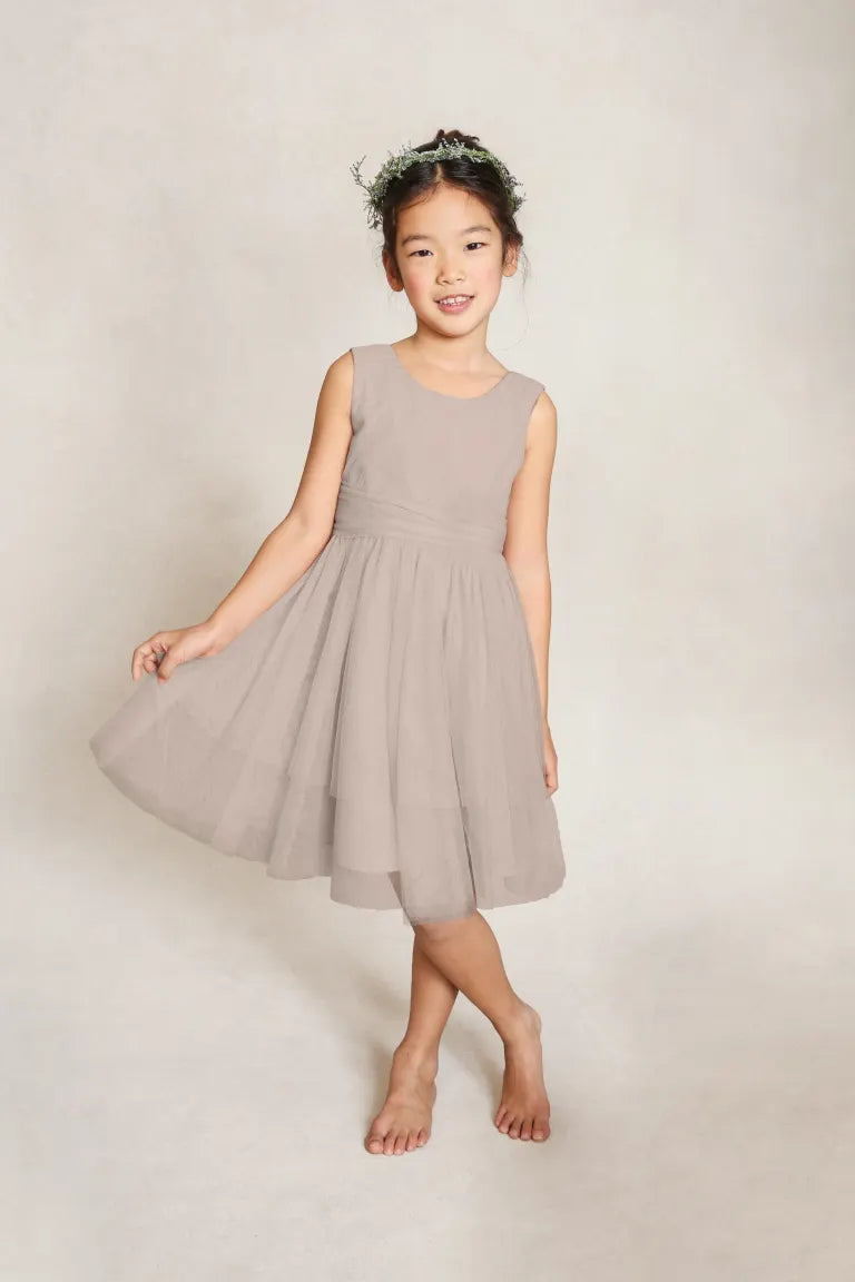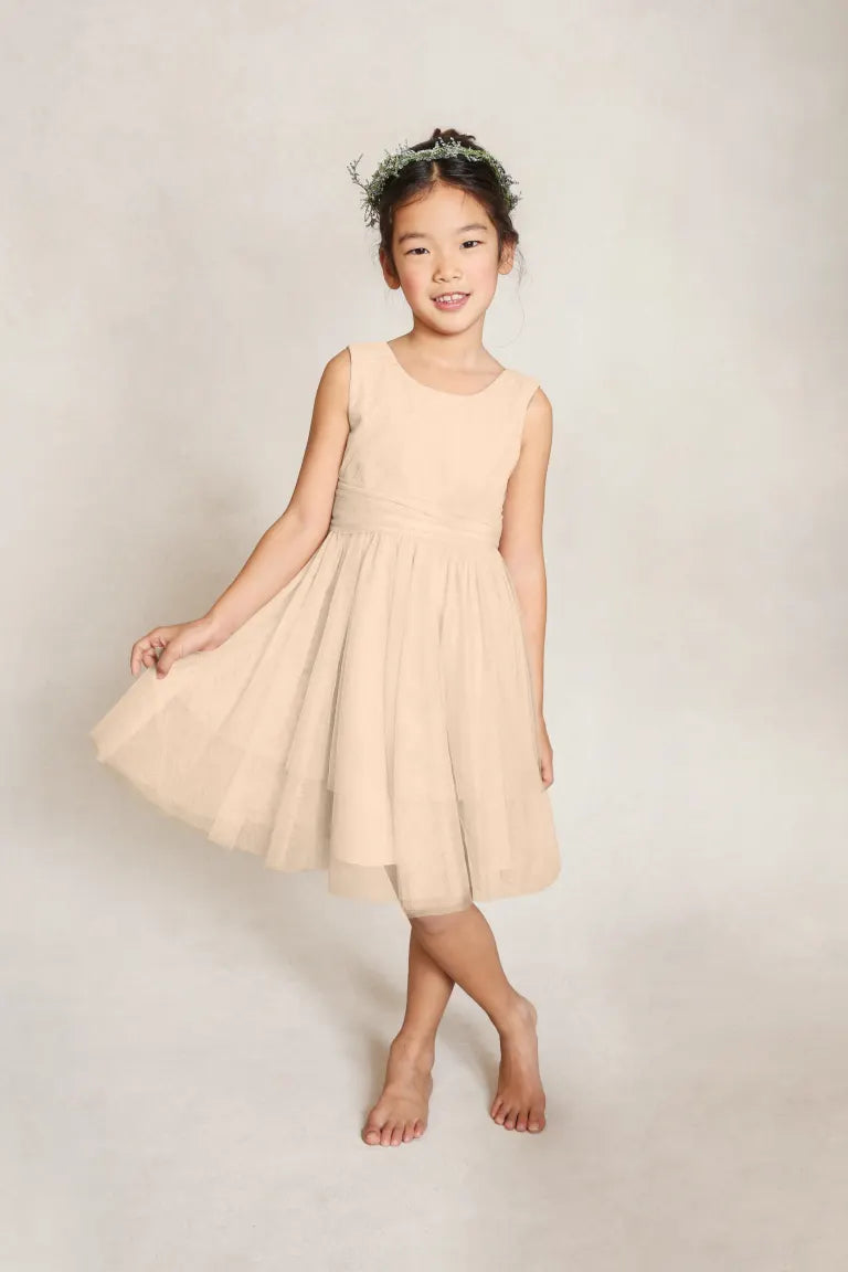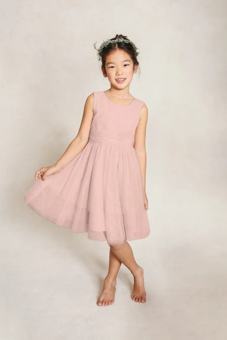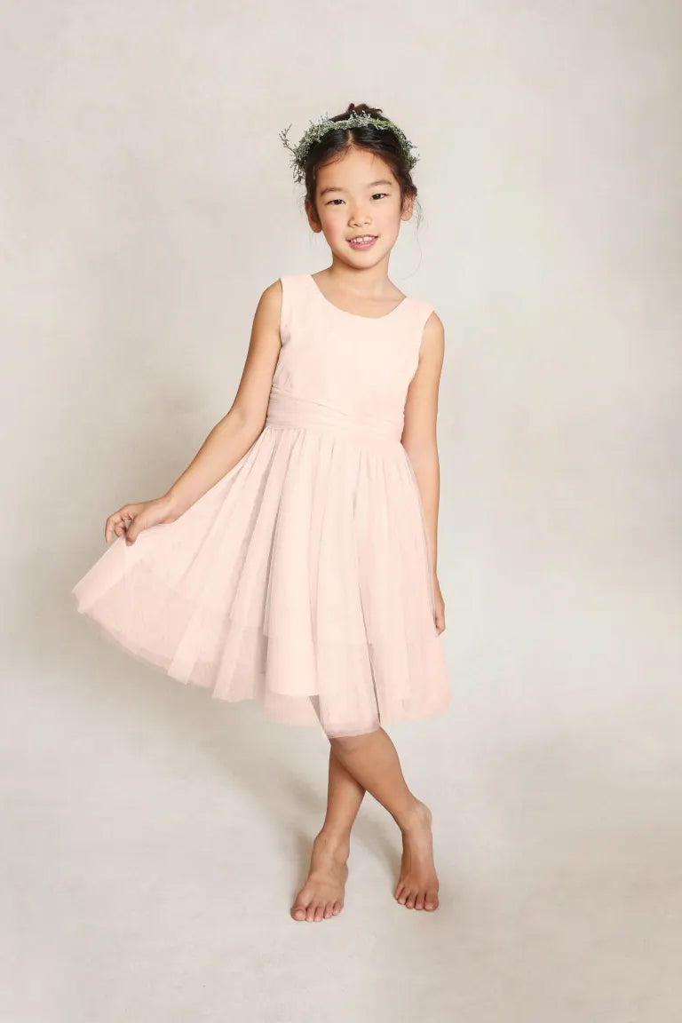 The Etsy tulle flower girl sleeveless dress showcases a jewel neckline, a double-layered full skirt, and a daintily gathered waistband that can be tied at the back. It comes in several colors too!