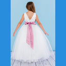 Style 5123 has a full tulle skirt with a satin V back bodice. The waist is accented with a bling satin sash with self-tying streamers. Satin buttons cover the zipper.