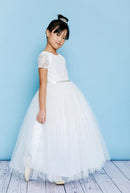 Style 5140 is a full-length dress featuring a sparkle tulle skirt with a sparkle lace bodice and sleeves. The waist is accented by a bling ribbon that ties to a bow in the back. Lace buttons cover the zipper.