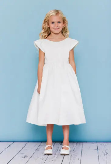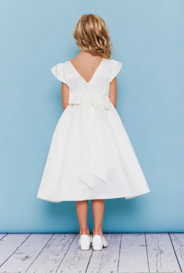 Style 5142 is a satin T-length dress with a scoop neckline and a V neck in the back with matching streamers that tie in the middle of the back. It has flutter sleeves and hide away pockets are included. Satin buttons cover the zipper.