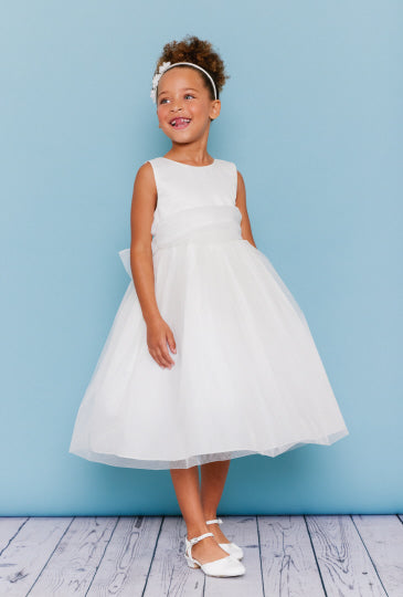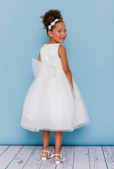 Style 5144 is a sleeveless T-length dress with a scoop neckline. A tulle cumber bund waist has a tulle bow in the back with satin buttons covering the zipper.