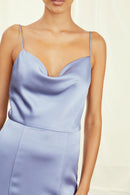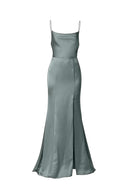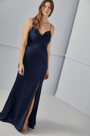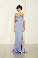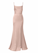 Drape neckline with low back, fit-to-flare dress with slit in fluid satin.