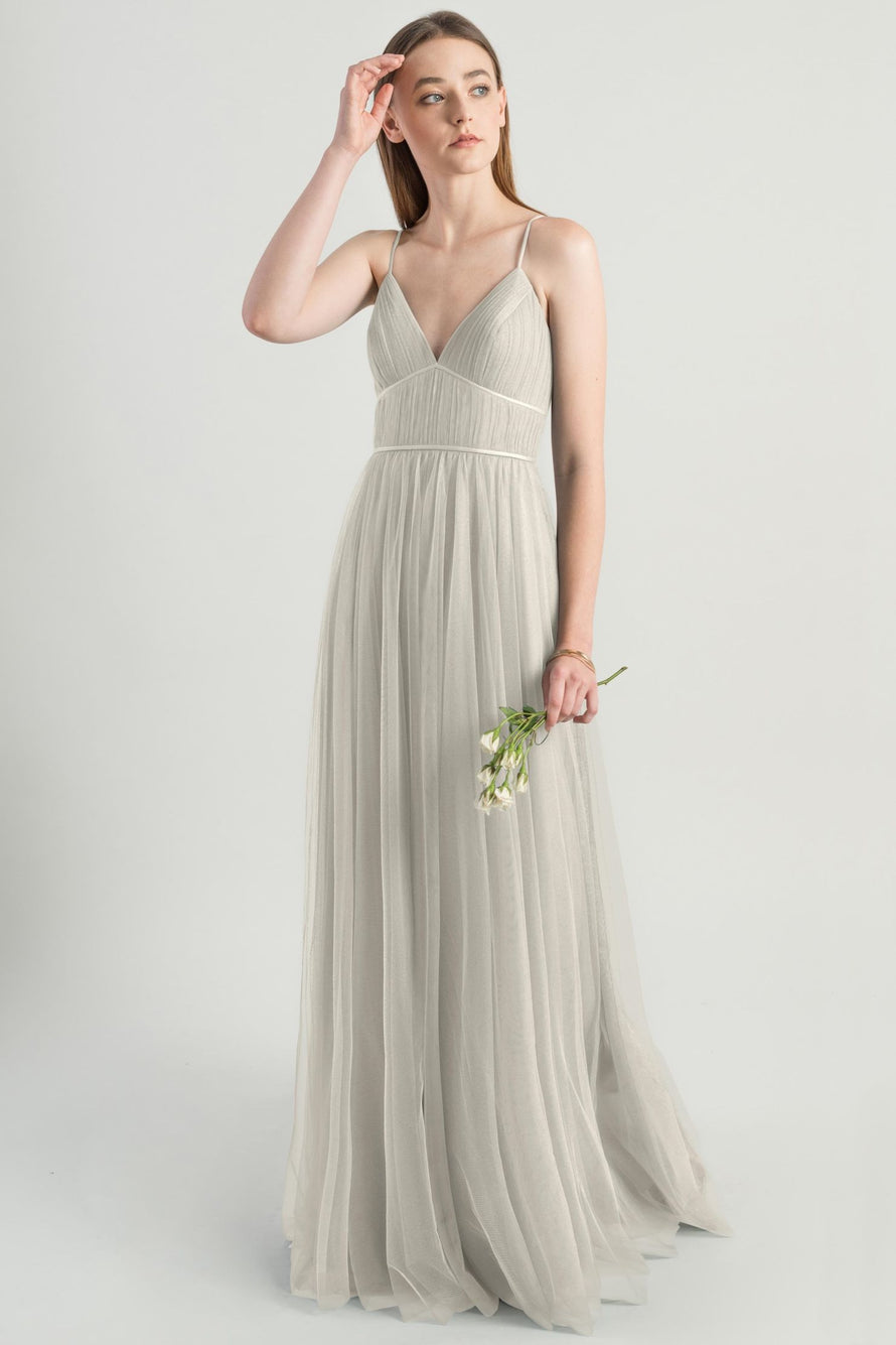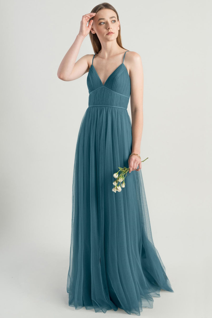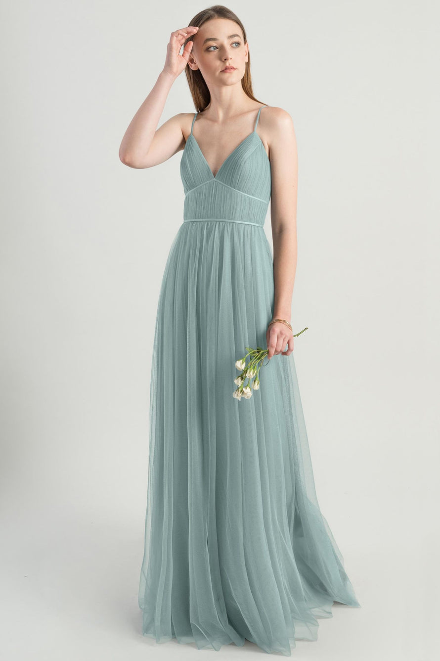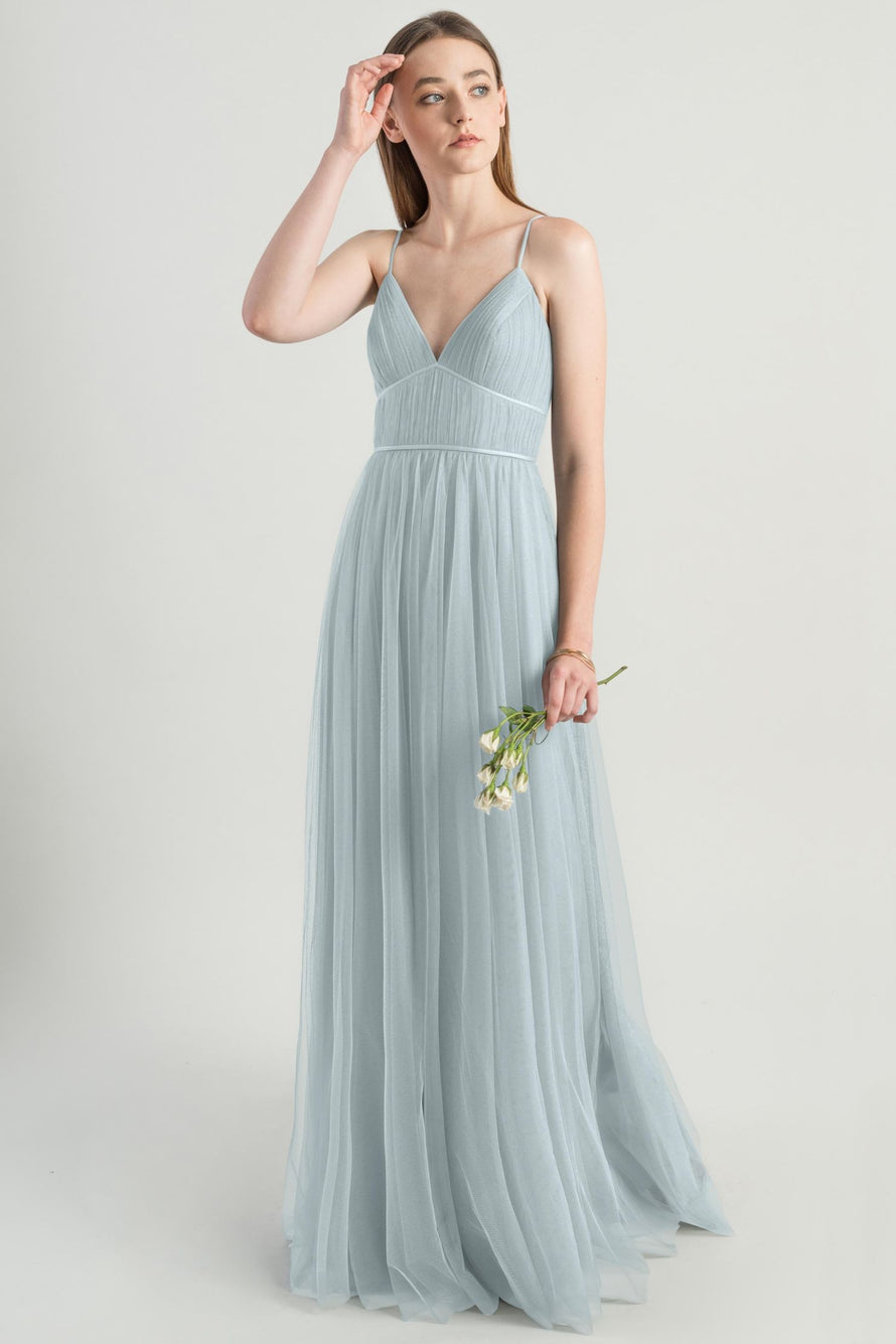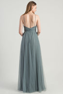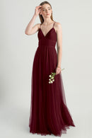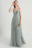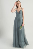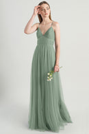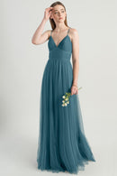 The Ali dress boasts a dreamy A-line silhouette, featuring a V-neckline with dainty spaghetti straps crafted from our ethereal Soft Tulle fabric. Adding a touch of refinement, two band details gracefully cinch the natural waist and meet at a captivating low V-back. Gentle ruching cascades from the fitted bodice onto the long, flowing circle skirt. This bridesmaid dress is fully lined and secures with an invisible zipper down the center back, ensuring both comfort and a seamless look.