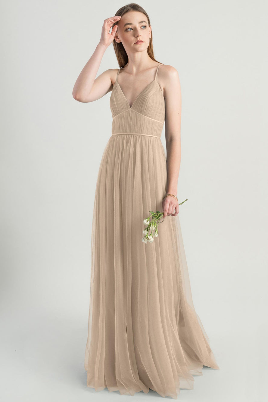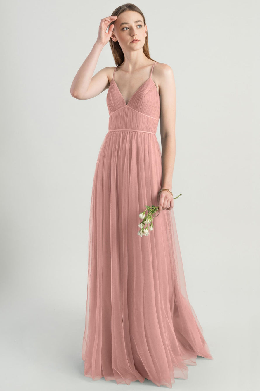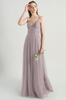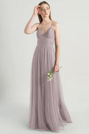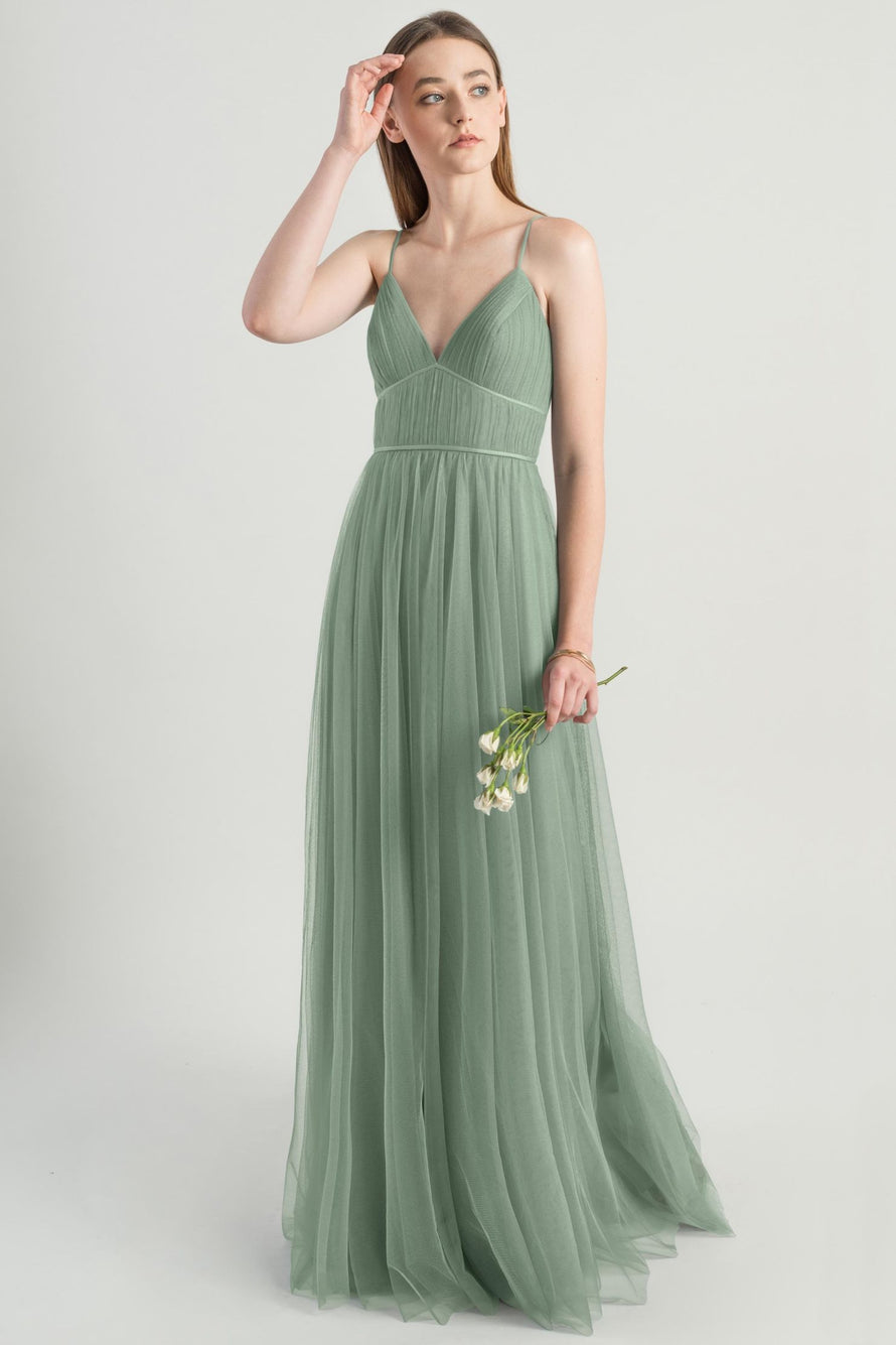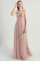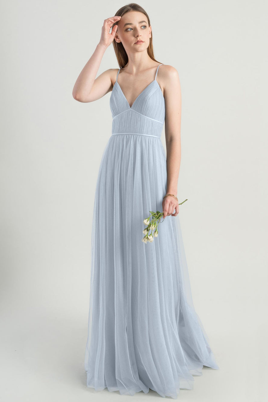 The Ali dress boasts a dreamy A-line silhouette, featuring a V-neckline with dainty spaghetti straps crafted from our ethereal Soft Tulle fabric. Adding a touch of refinement, two band details gracefully cinch the natural waist and meet at a captivating low V-back. Gentle ruching cascades from the fitted bodice onto the long, flowing circle skirt. This bridesmaid dress is fully lined and secures with an invisible zipper down the center back, ensuring both comfort and a seamless look.