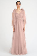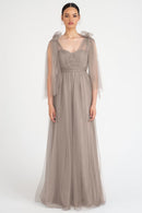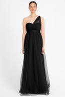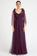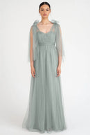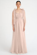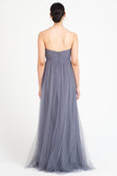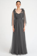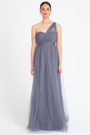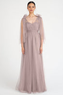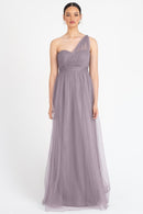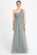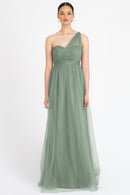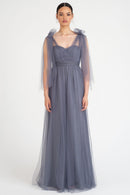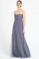 The Annabelle dress showcases a shirred strapless bodice with a sweetheart neckline, offering a universally flattering look. The floor-length gathered A-line skirt features convertible panels that allow for the creation of alternate necklines and strap details. Additionally, the dress includes a detachable tulle sash, which can be tied around the waist to provide definition and complete the overall look. This versatile dress ensures that bridesmaids can customize their style while maintaining an elegant and cohesive appearance.