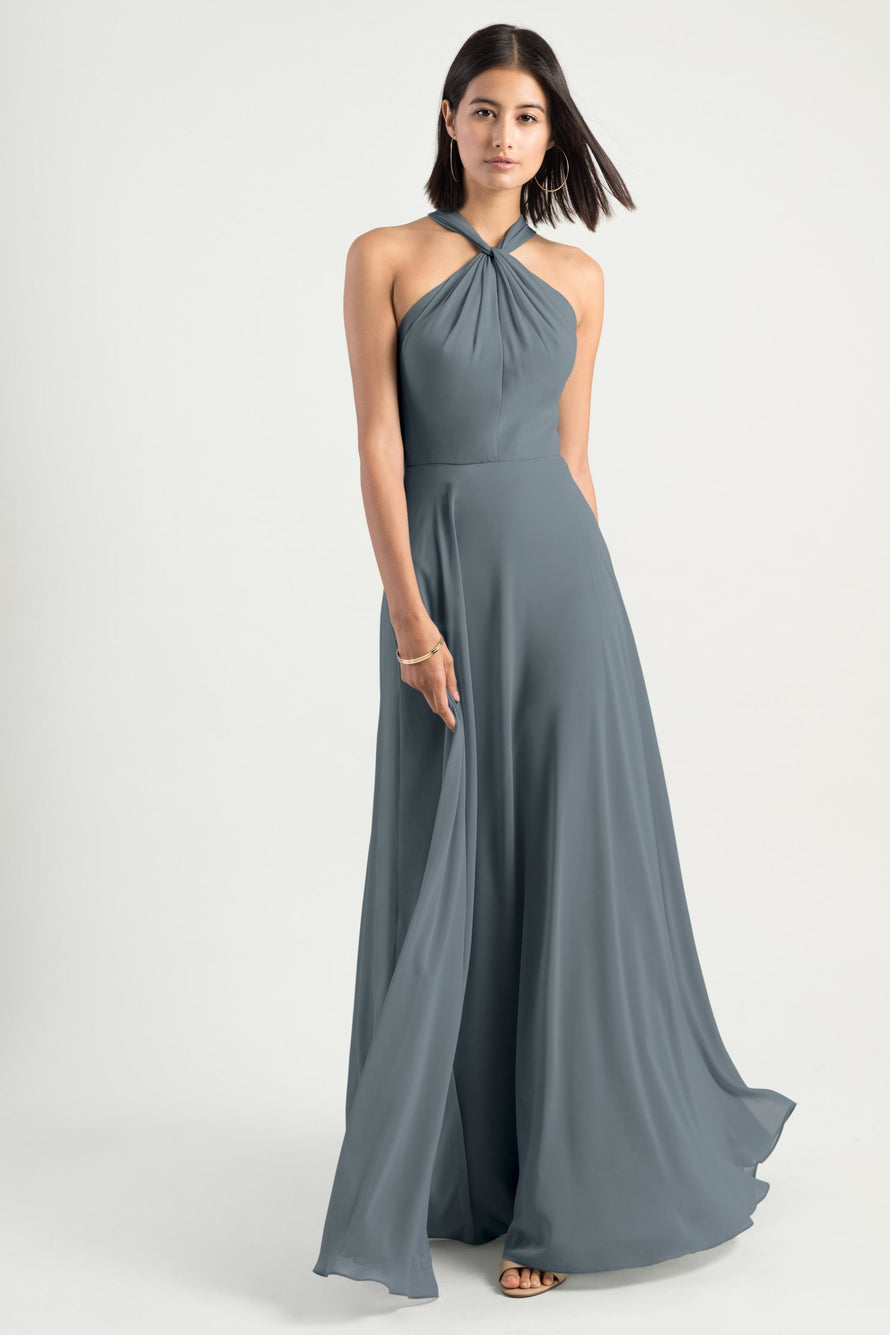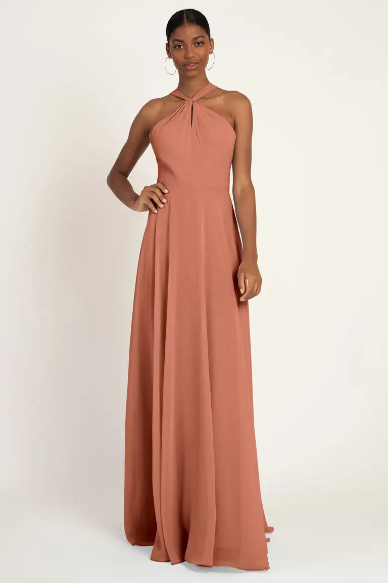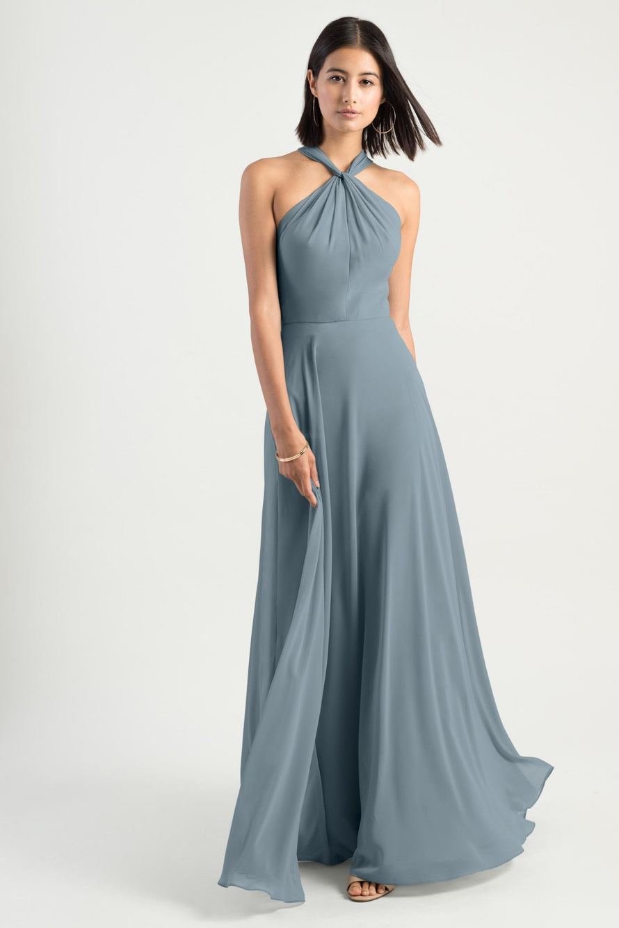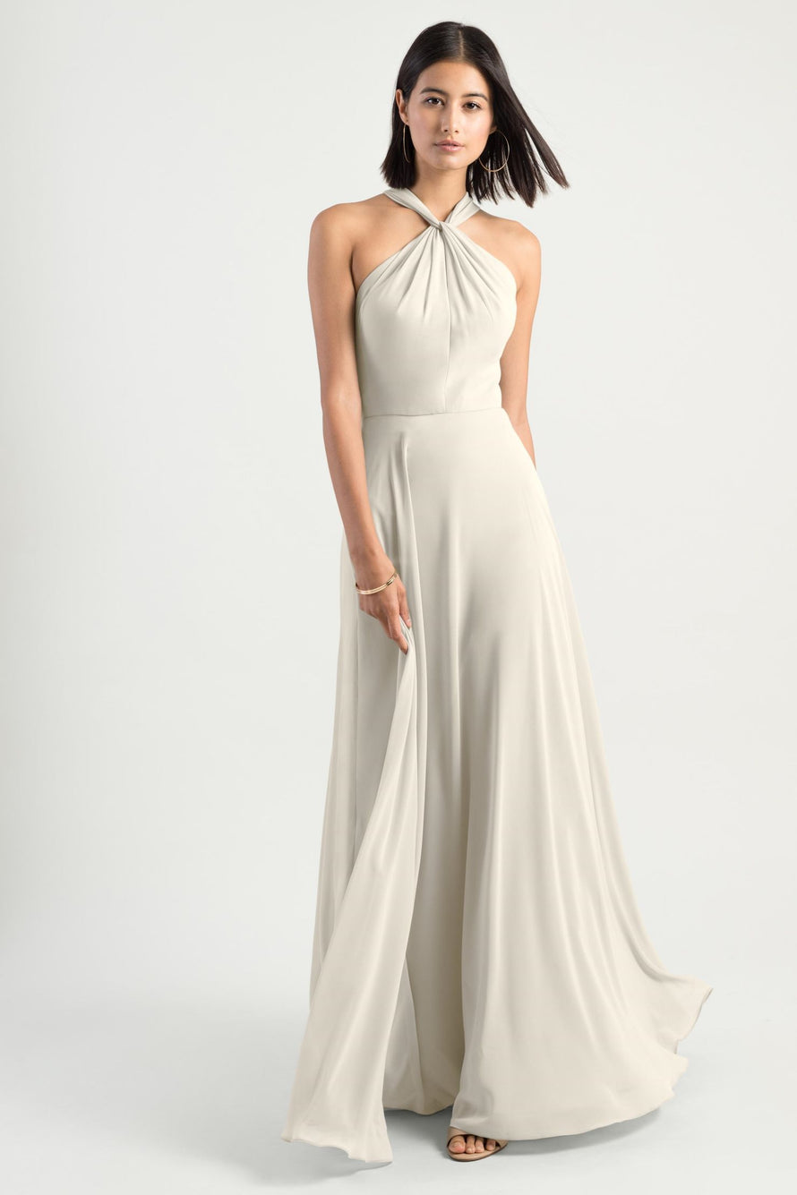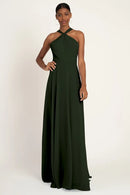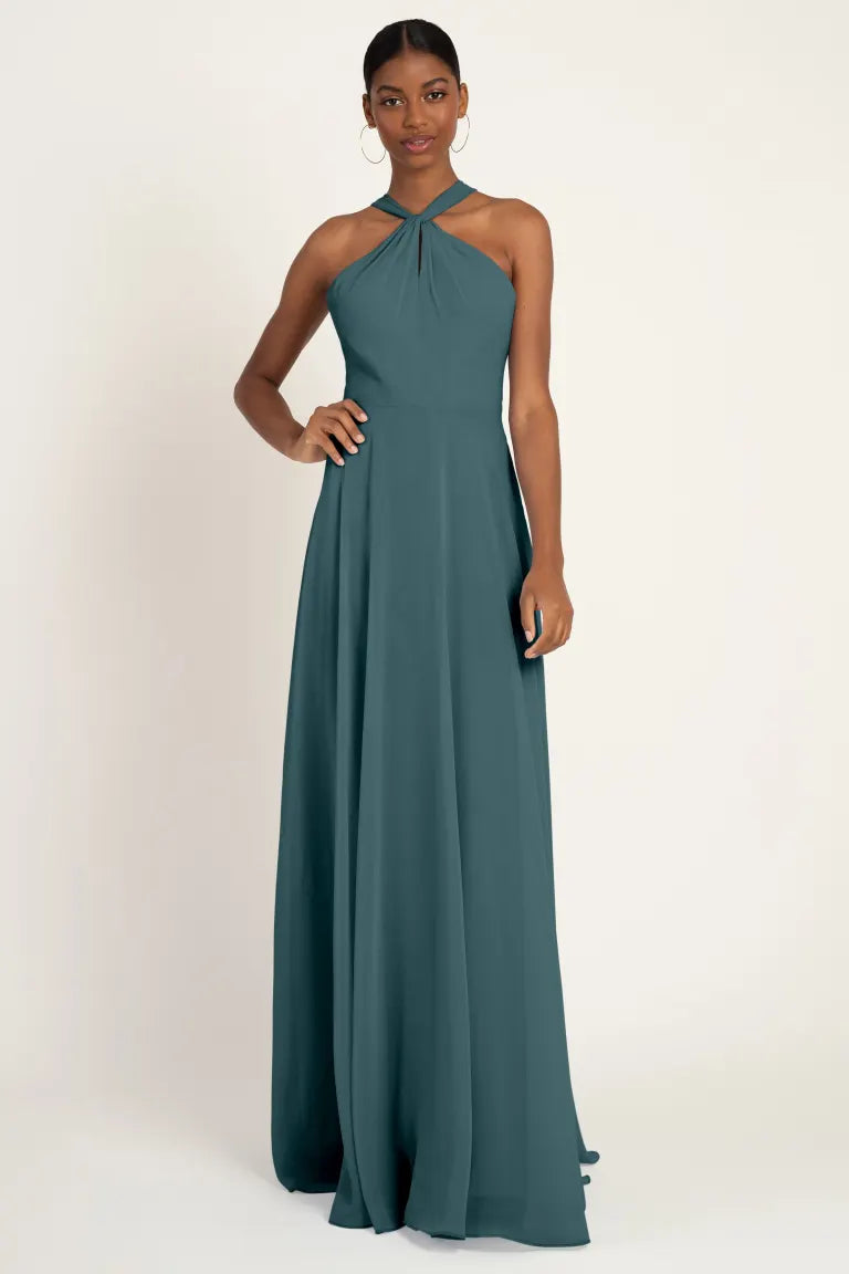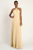 The Halle bridesmaid dress showcases a modern twisted halter neck with a slim keyhole detail. The fitted bodice contrasts with the full, flowing Luxe Chiffon circle skirt, creating a balanced and elegant silhouette. The dress's straps fasten with clear buttons at the center back, forming a flattering X shape, adding a touch of sophistication and style to the design.