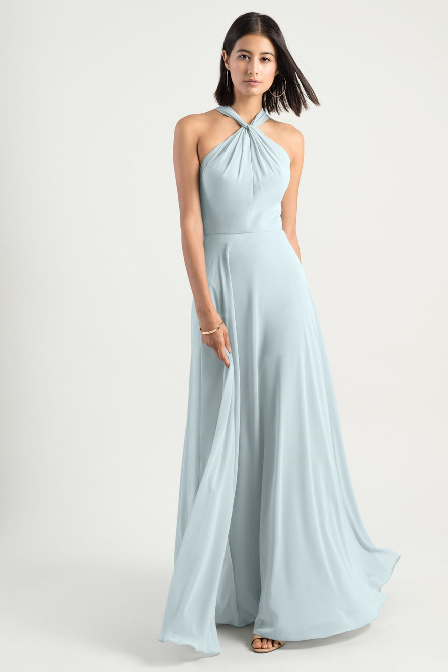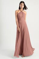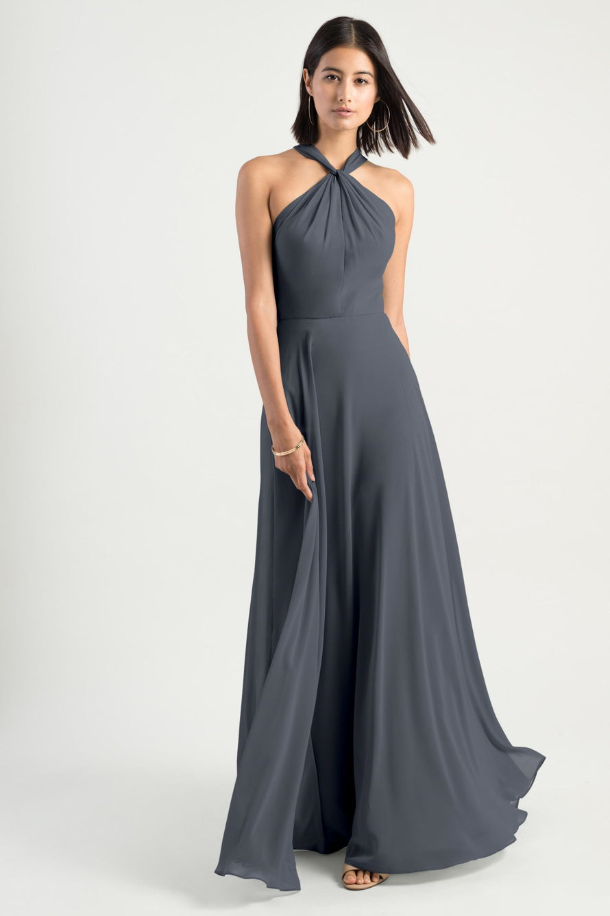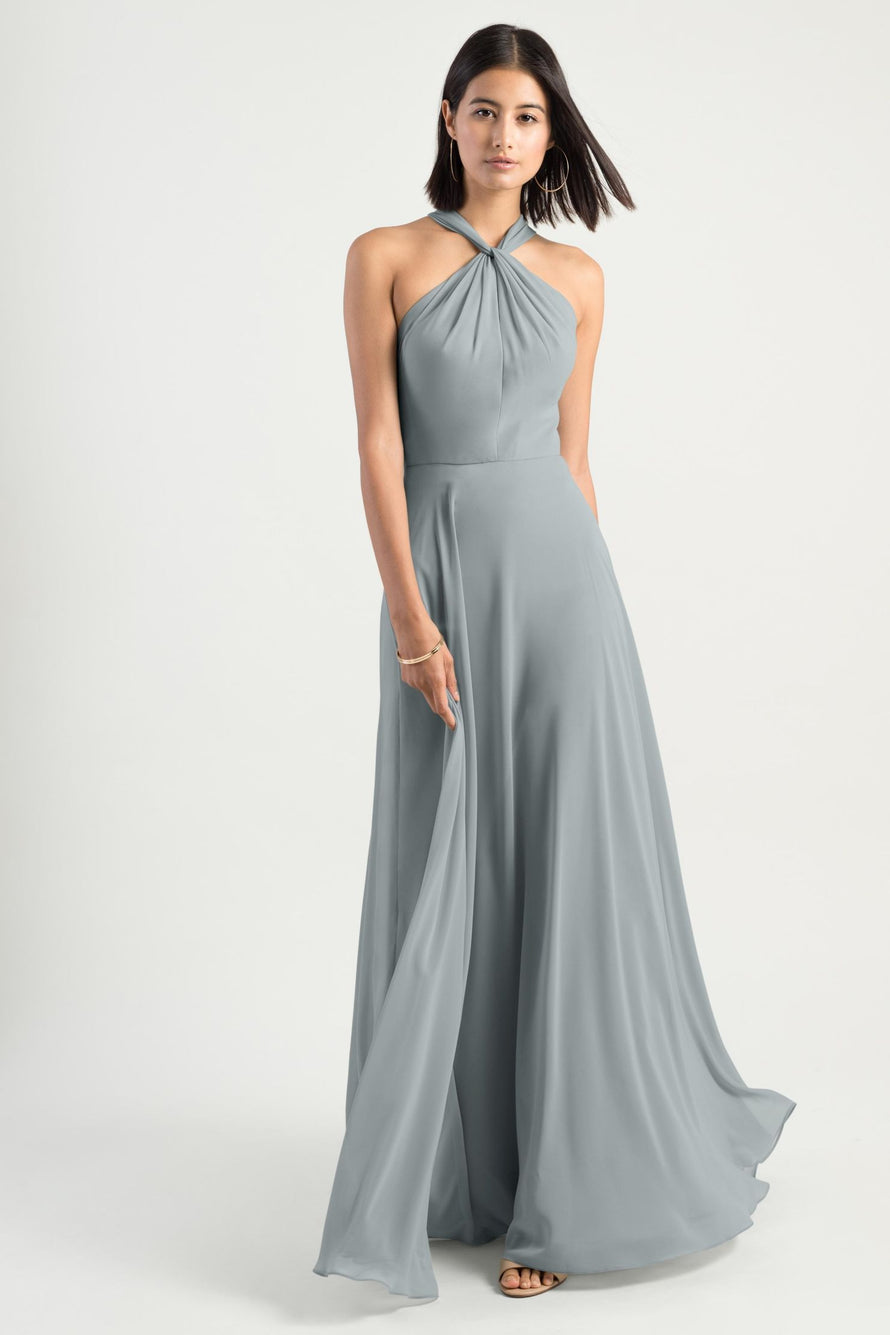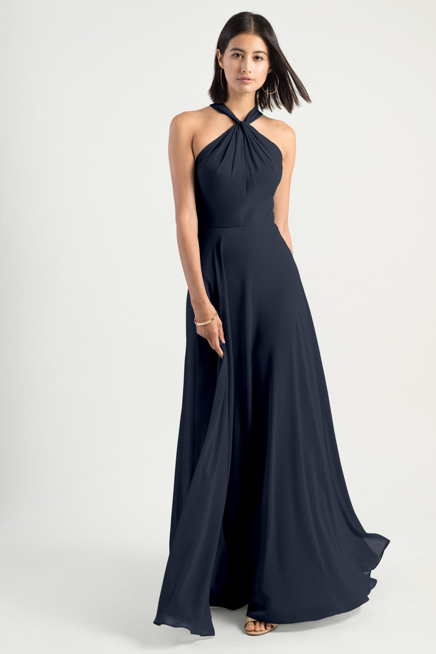 The Halle bridesmaid dress showcases a modern twisted halter neck with a slim keyhole detail. The fitted bodice contrasts with the full, flowing Luxe Chiffon circle skirt, creating a balanced and elegant silhouette. The dress's straps fasten with clear buttons at the center back, forming a flattering X shape, adding a touch of sophistication and style to the design.
