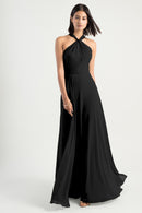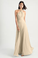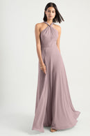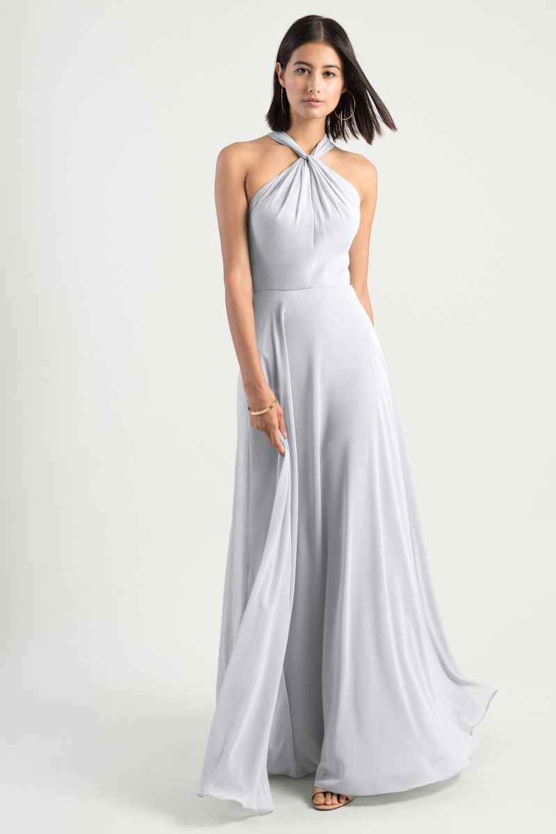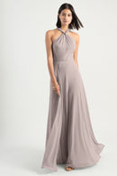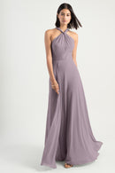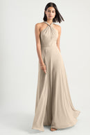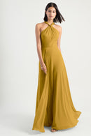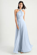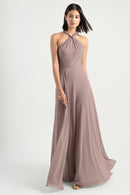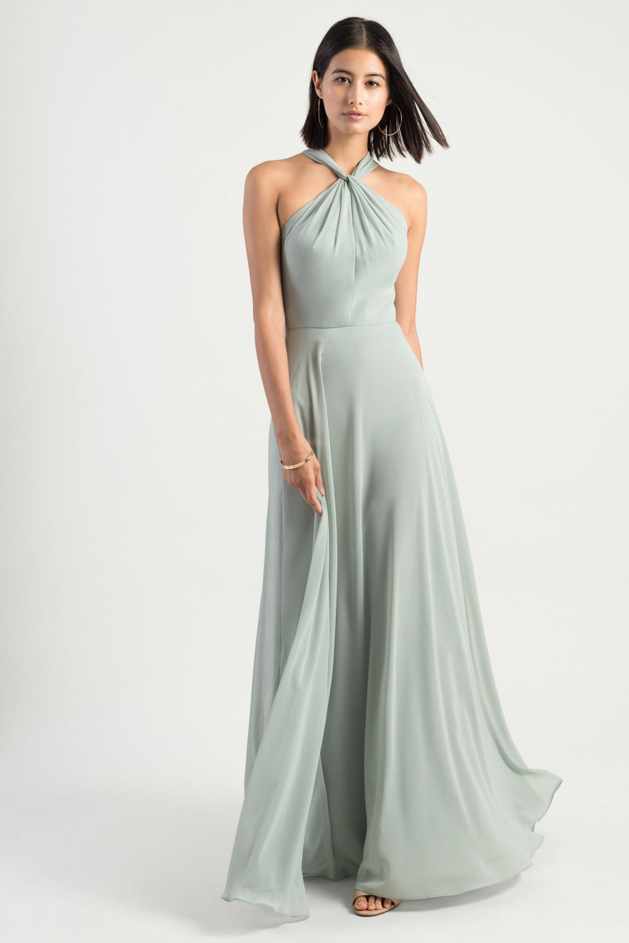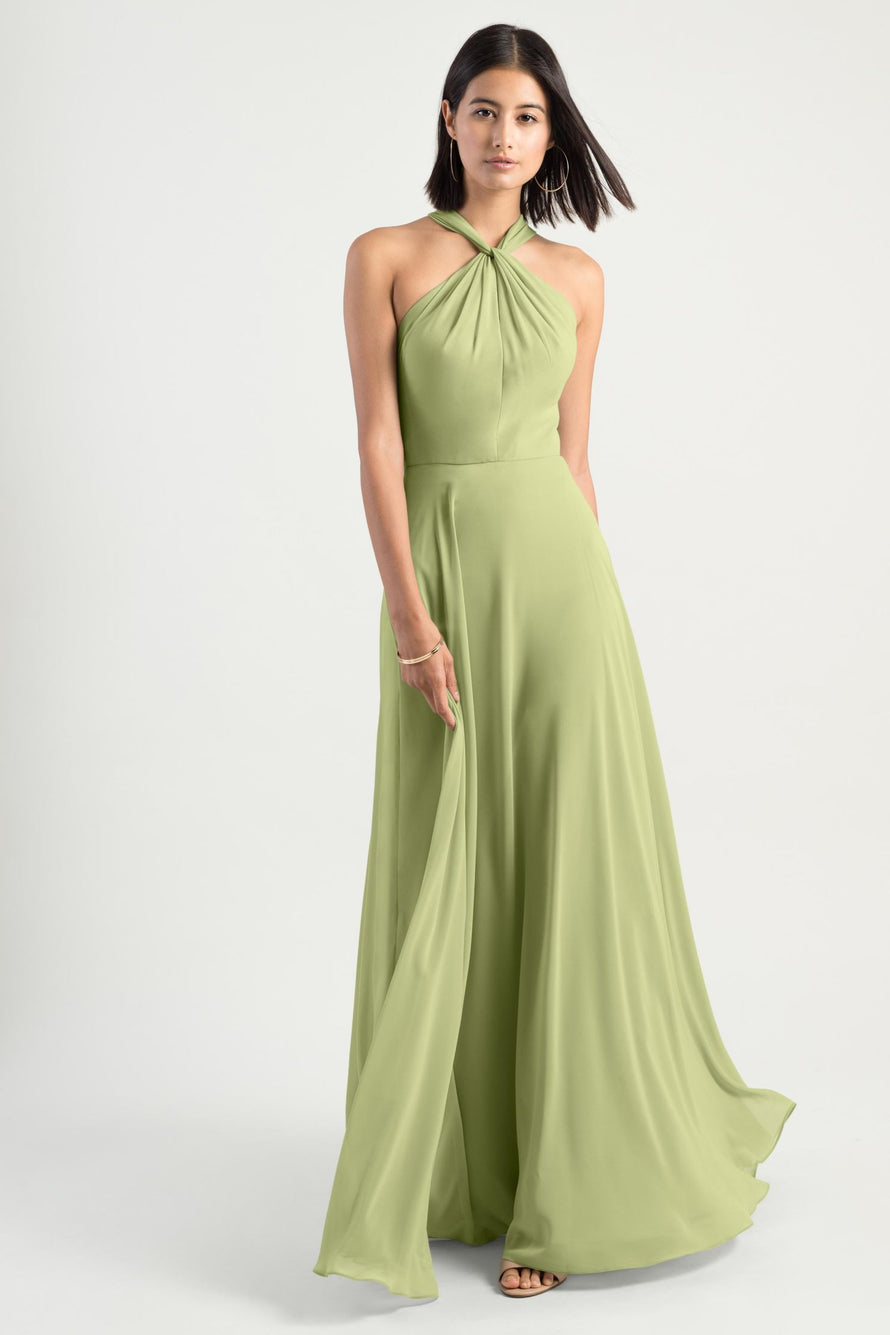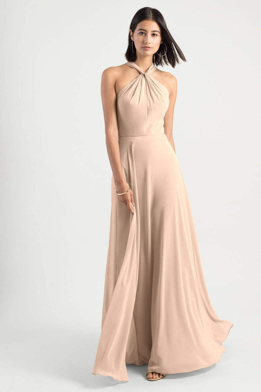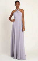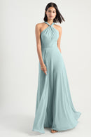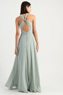 The Halle bridesmaid dress showcases a modern twisted halter neck with a slim keyhole detail. The fitted bodice contrasts with the full, flowing Luxe Chiffon circle skirt, creating a balanced and elegant silhouette. The dress's straps fasten with clear buttons at the center back, forming a flattering X shape, adding a touch of sophistication and style to the design.
