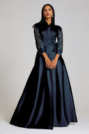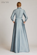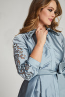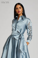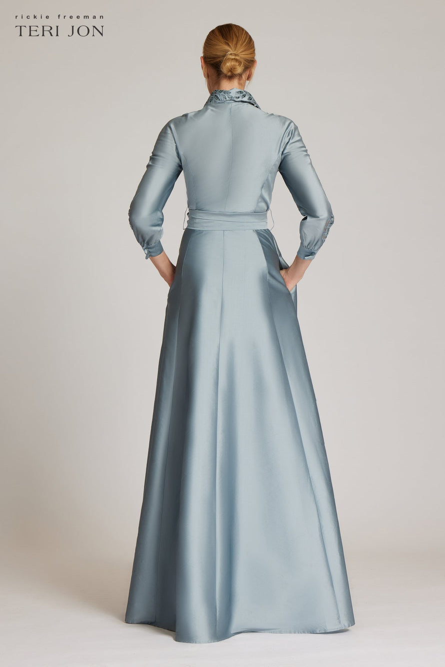 Introducing our versatile taffeta shirt dress gown, a timeless choice for the mother of the bride or groom. Available in a stunning slate blue, this classic style is universally flattering featuring an eyelet sleeve and collar detail making it both elegant and one of a kind, while the removable sash belt cinches the waist beautifully. With a full-length skirt and ¾ sleeves with cuffs, this gown is perfect for any season and exudes sophistication.