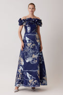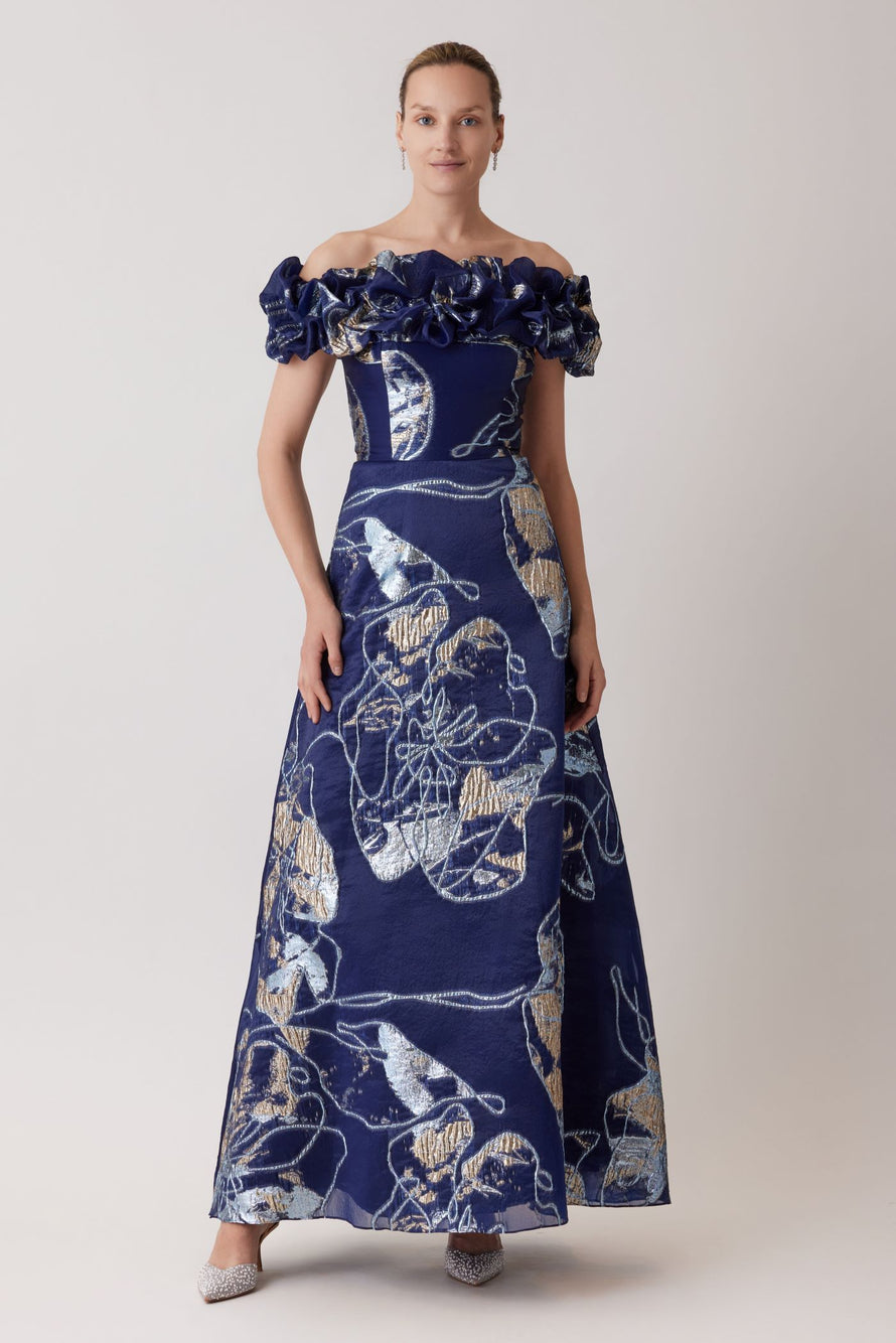 JACQUARD SCRUNCH BODICE OFF SHOULDER GOWN