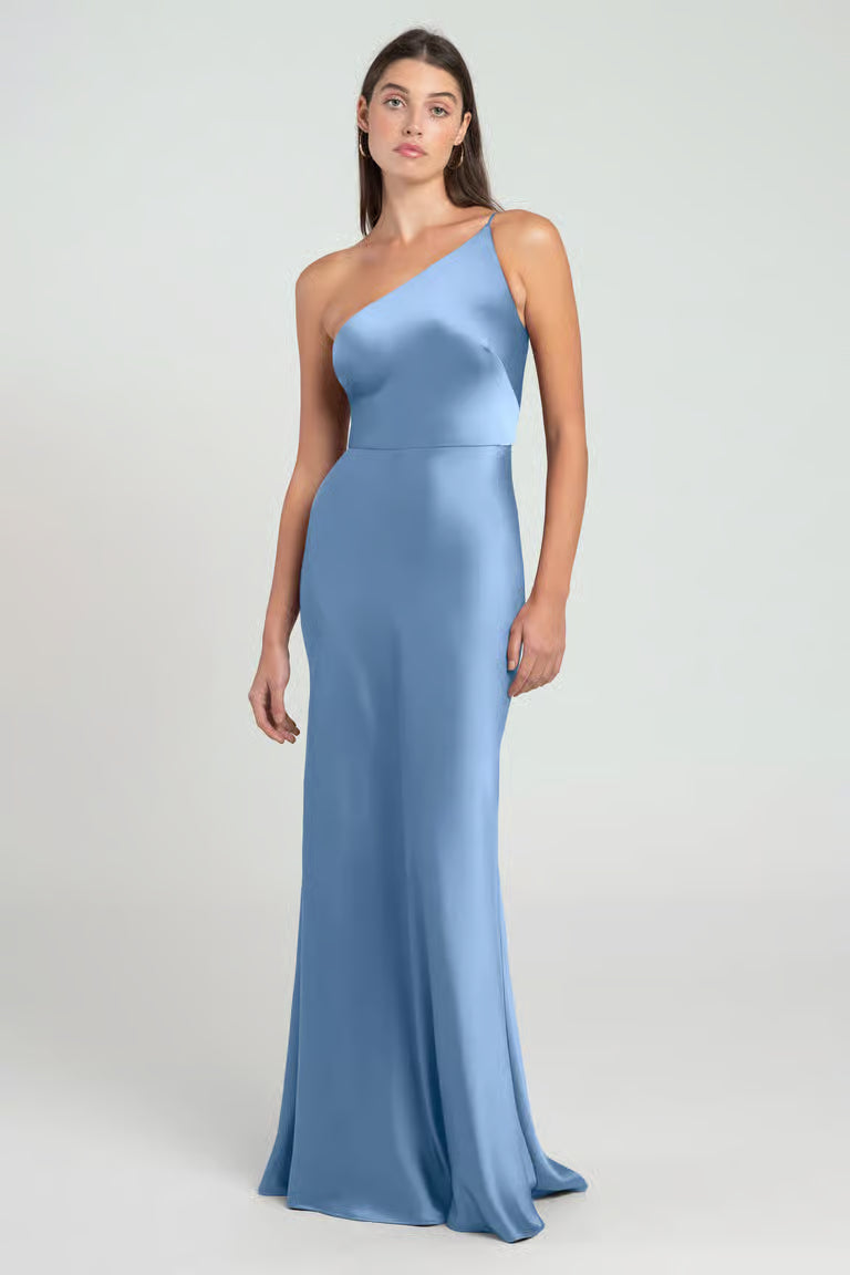 The Marlowe dress cut in our Luxe Satin fabric features a one shoulder spaghetti strap with a natural waist and an elegant skirt that flatters your curves.