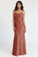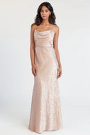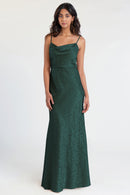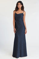The Dahlia bridesmaid dress in the luxuriously textured Gemma satin burnout is adorned with a gentle cowl neckline and a blouson waist that elegantly drapes, providing a flattering silhouette. The slim A-line skirt, cut on the bias, glides gracefully over your curves, enhancing your natural beauty. This stylish dress is a delightful addition to any mix-and-match bridal party ensemble.