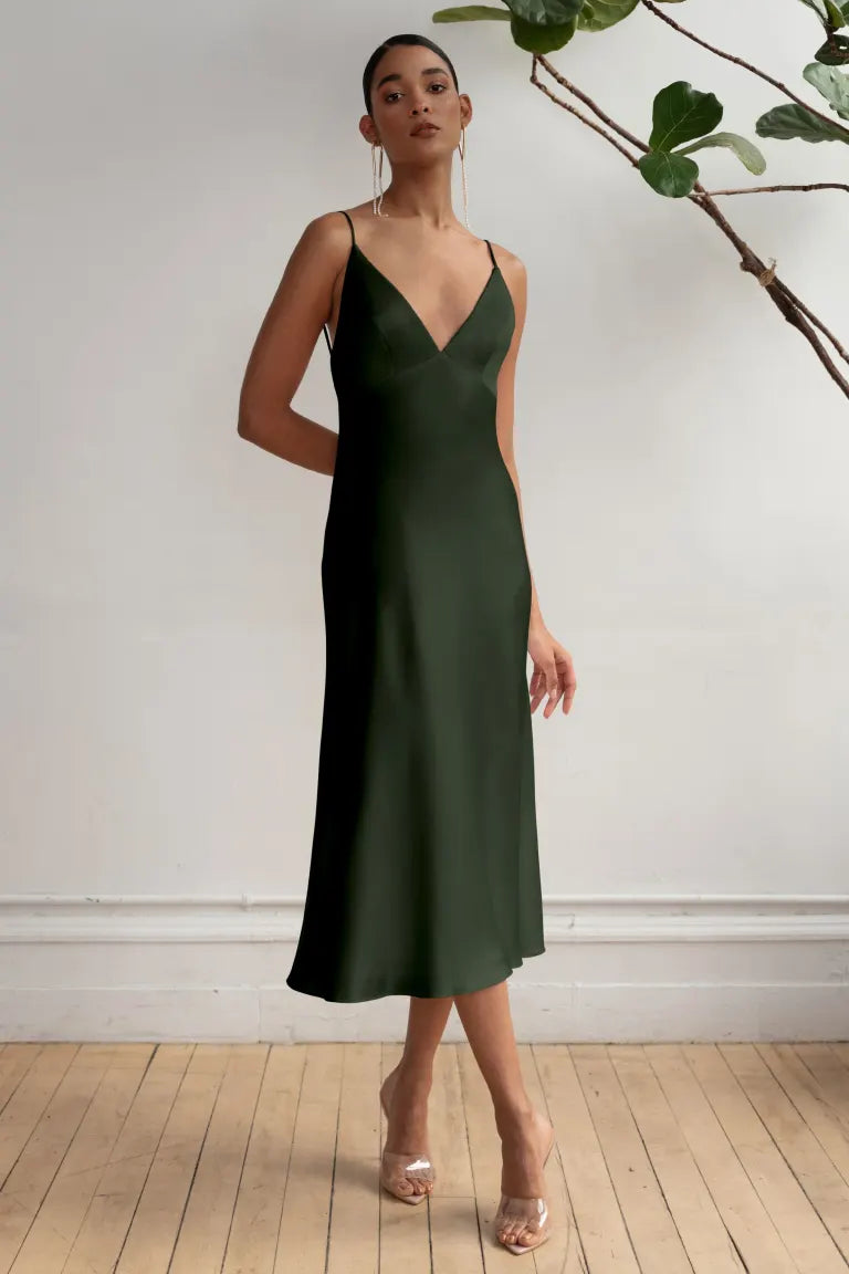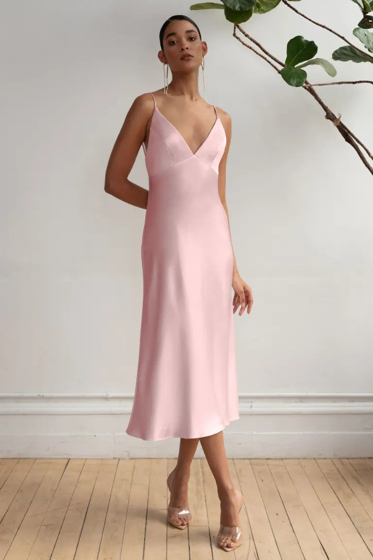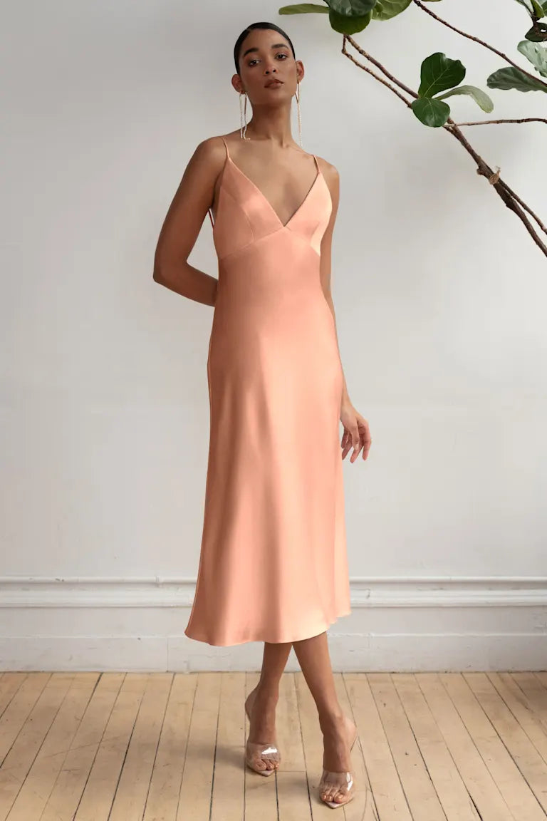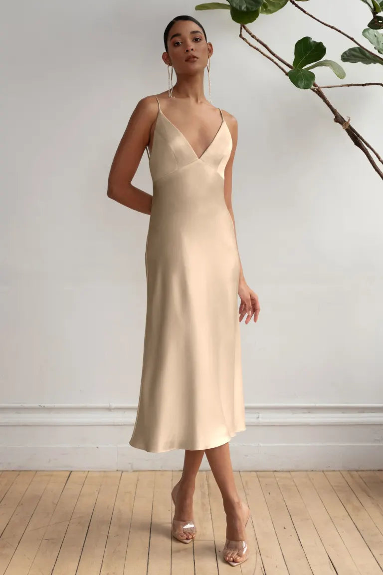 Introducing the Bellini satin slip dress, a sophisticated and modern twist on the timeless slip dress. This exquisite design showcases a V-neckline and spaghetti straps that gracefully highlight your shoulders and collarbone. With an alluring low scoop back and a slinky bias-cut skirt, and a dainty tie-back detail, this dress exudes flirtatious charm.
