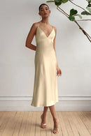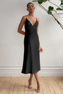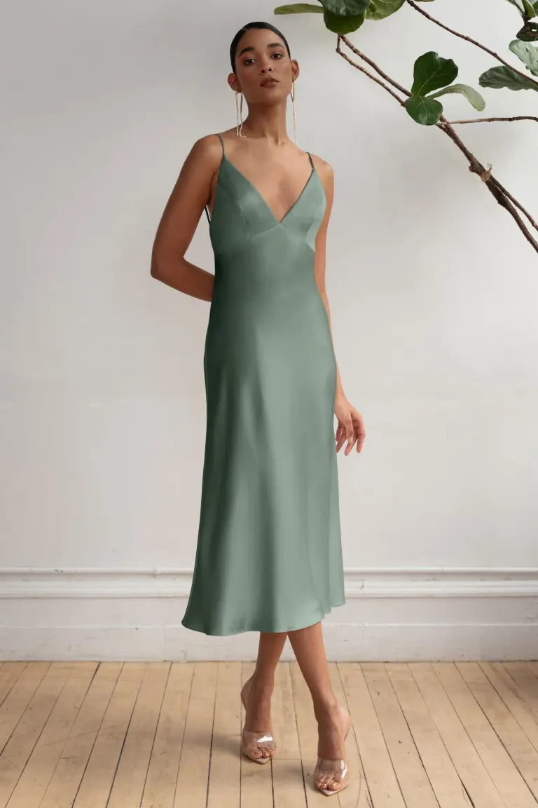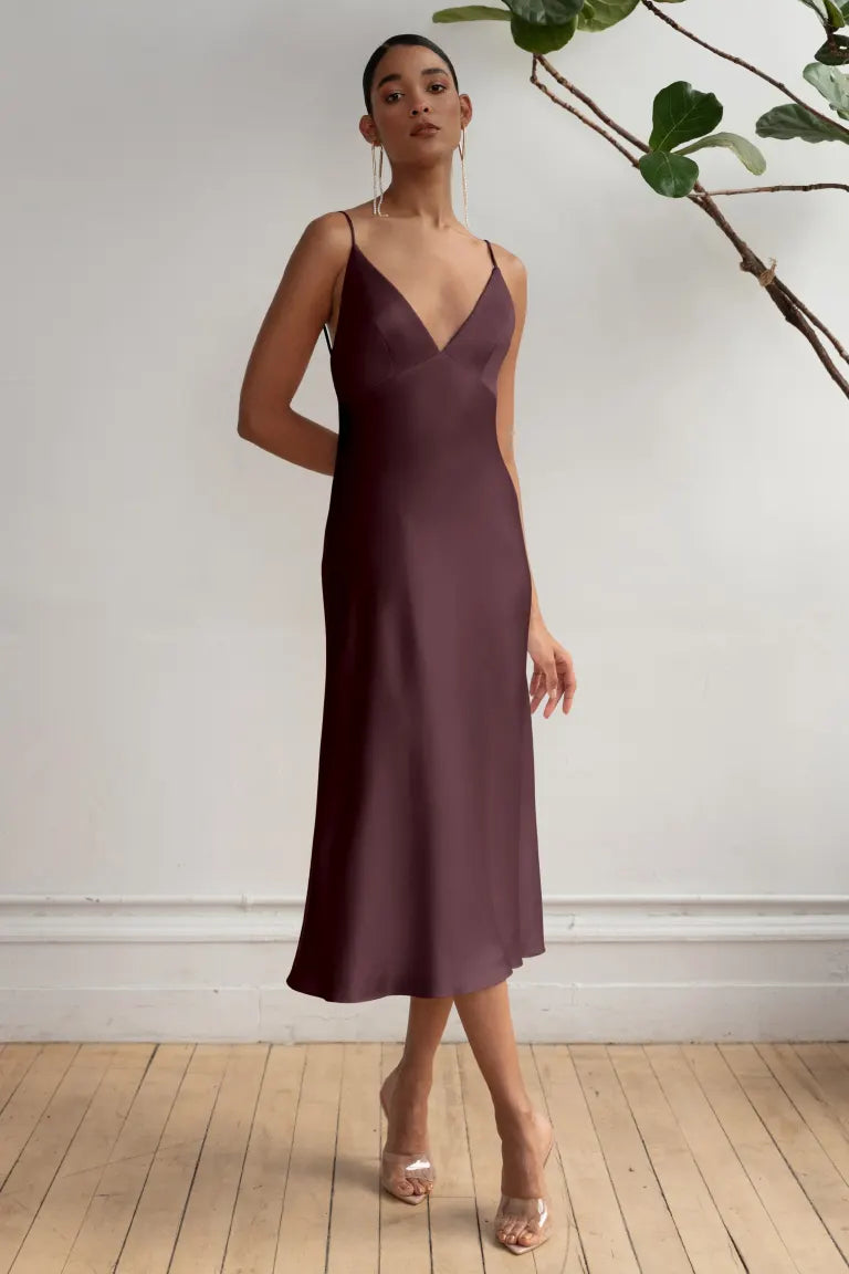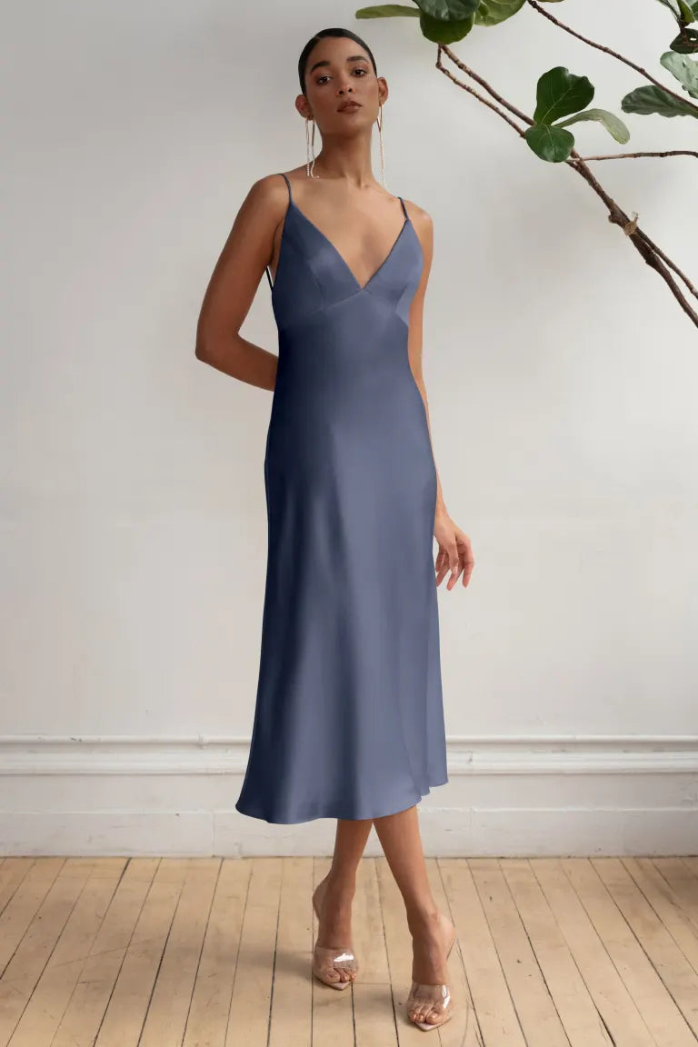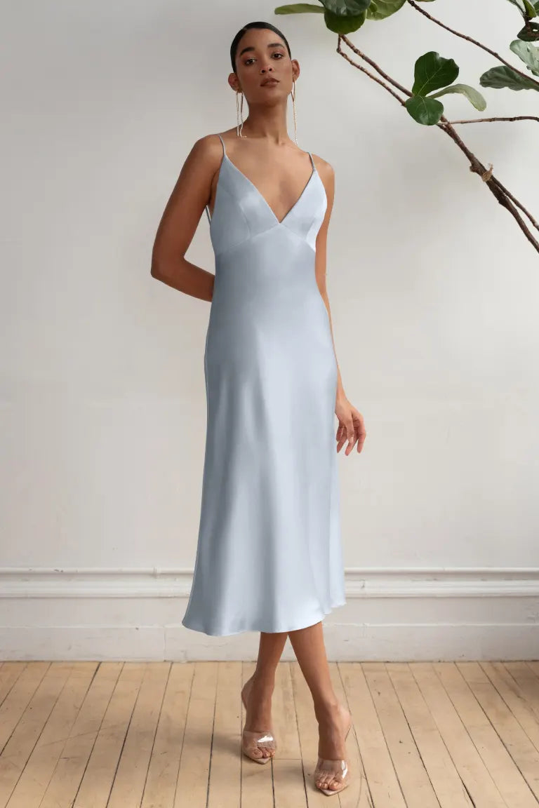 Introducing the Bellini satin slip dress, a sophisticated and modern twist on the timeless slip dress. This exquisite design showcases a V-neckline and spaghetti straps that gracefully highlight your shoulders and collarbone. With an alluring low scoop back and a slinky bias-cut skirt, and a dainty tie-back detail, this dress exudes flirtatious charm.