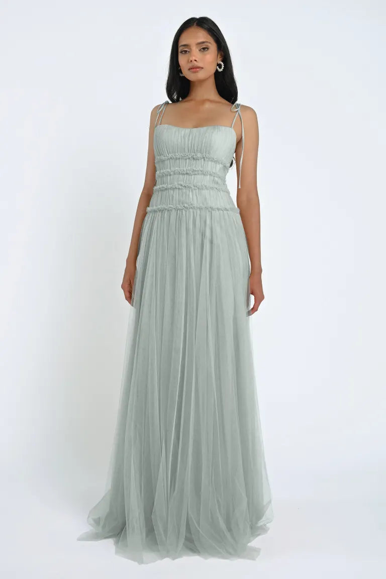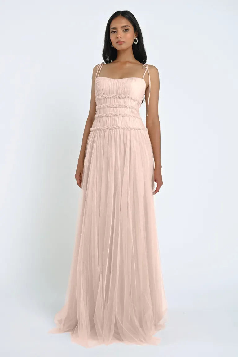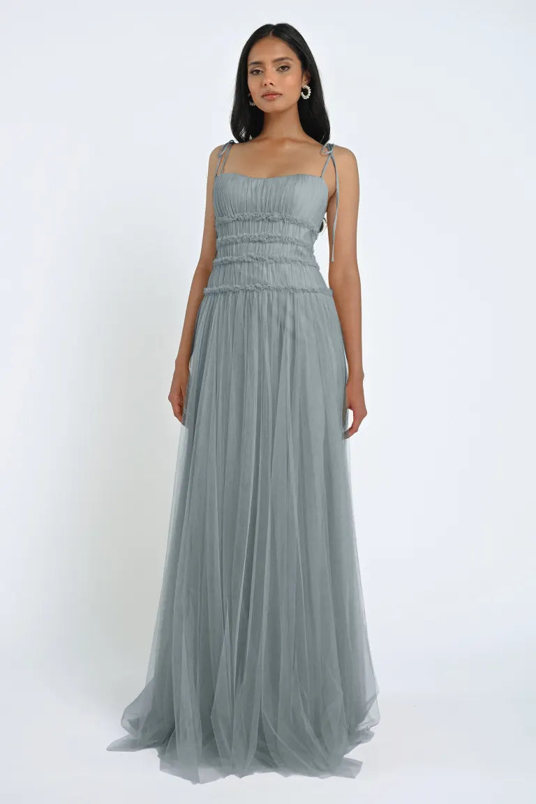The Berkley dress, cut in our lighter than air soft tulle fabric is beautifully romantic. Spaghetti straps tie at the shoulders for easy wearability, and a subtle dropped waist and delicate ruffles address the current trends.