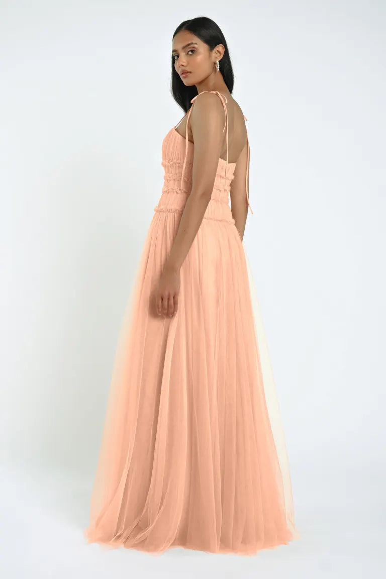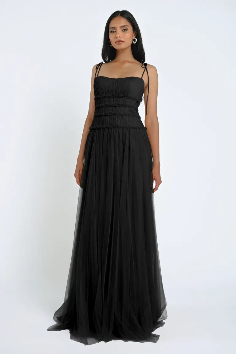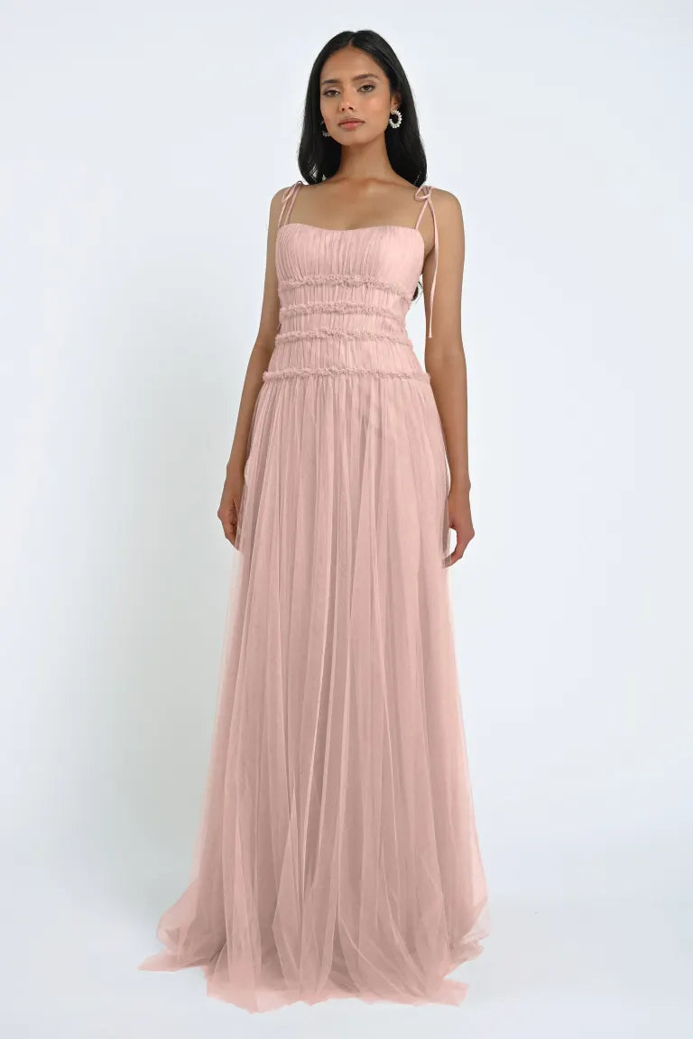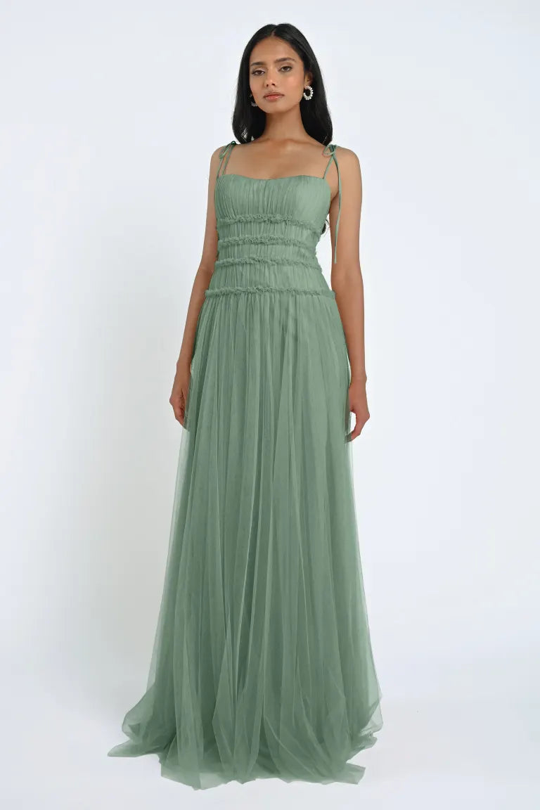 The Berkley dress, cut in our lighter than air soft tulle fabric is beautifully romantic. Spaghetti straps tie at the shoulders for easy wearability, and a subtle dropped waist and delicate ruffles address the current trends.