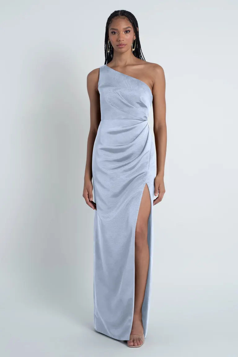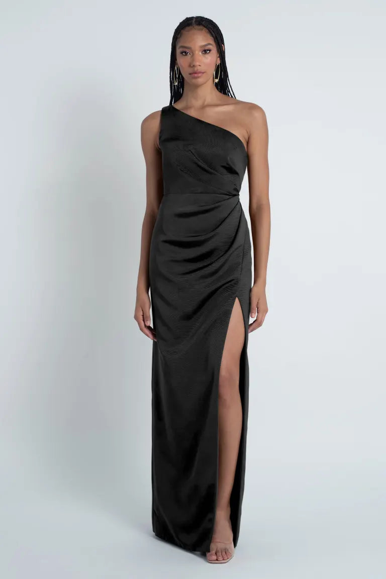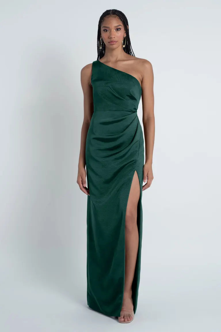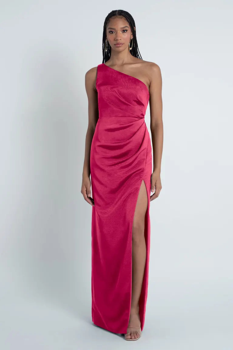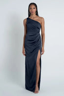 The Carolina dress is crafted from our wonderfully textured Luxe Faille fabric and showcases a stunning one-shoulder neckline. It also features flattering asymmetrical pleats through the bodice and a slim pegged skirt with a daring slit for added allure.