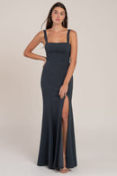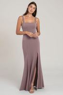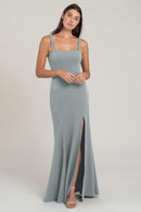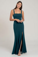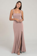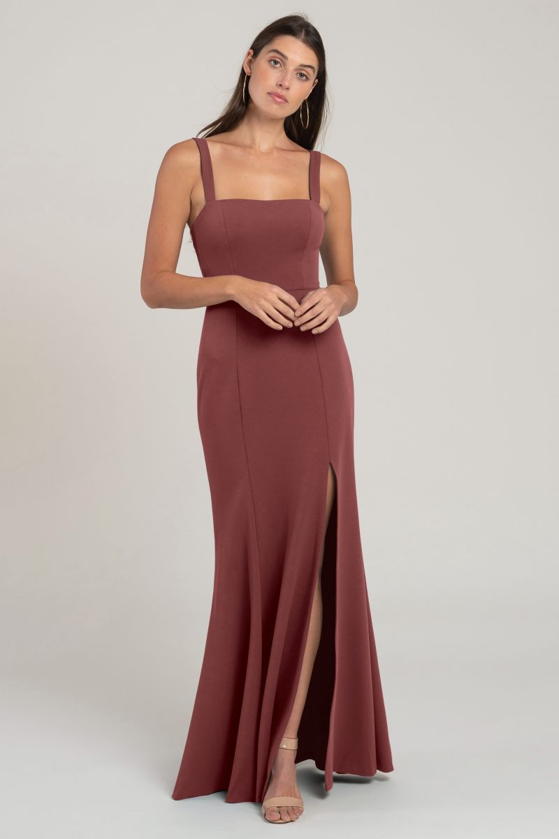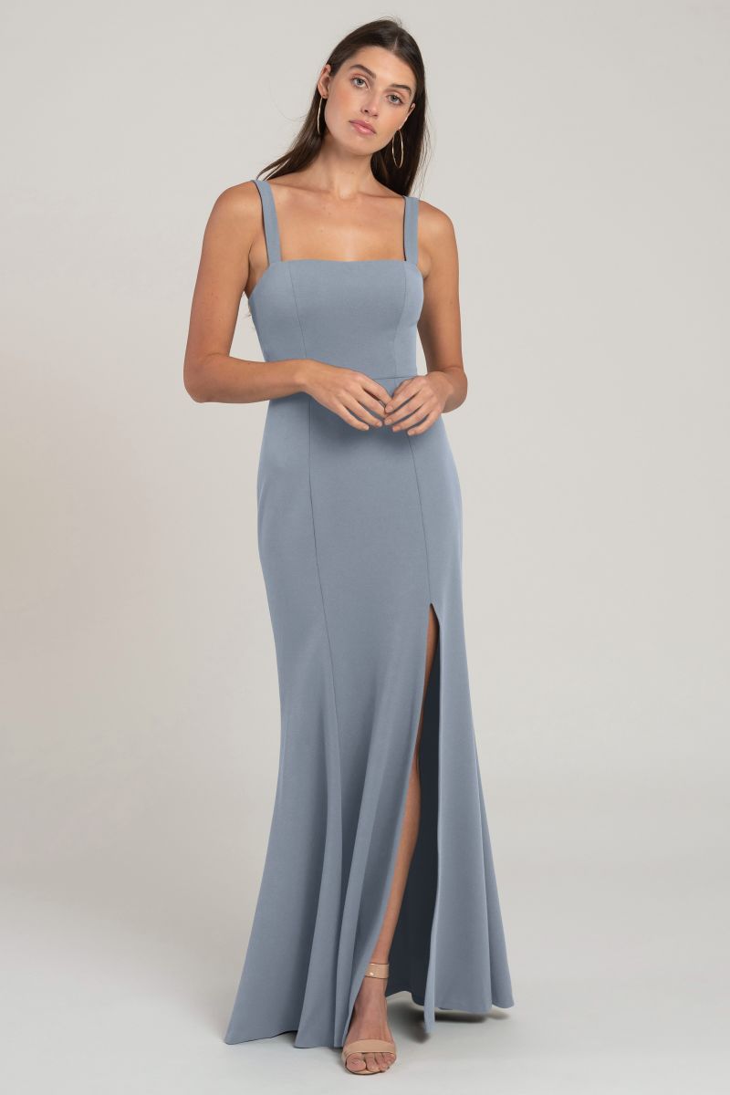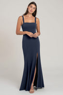 The Jenner square neck fit-and-flare bridesmaid dress in knit crepe is designed to flatter every curve. With wide-set straps and a side slit skirt, this style exudes serious cool-girl attitude, making it a fashionable and flattering choice for any bridal party.