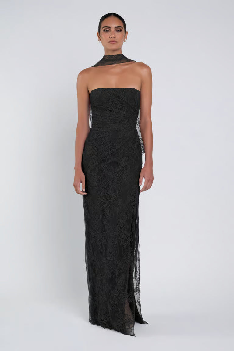 The Julian dress, cut in delicate Vinetta Chantilly lace, has a chic strapless neckline, flattering pleat details and a sultry side slit.