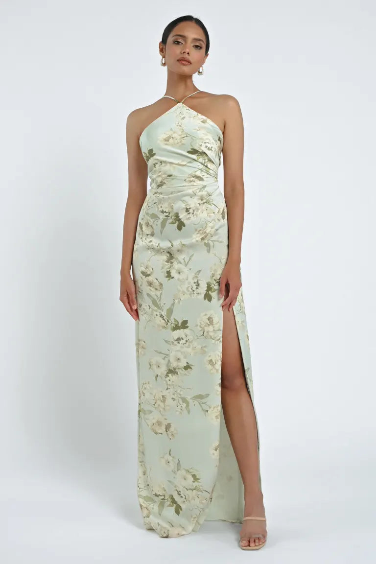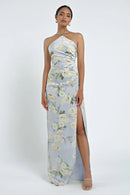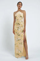 The Riley dress features a chic halter neckline and flattering asymmetrical pleats. The sleek pegged skirt cuts away to revel a daring slit.