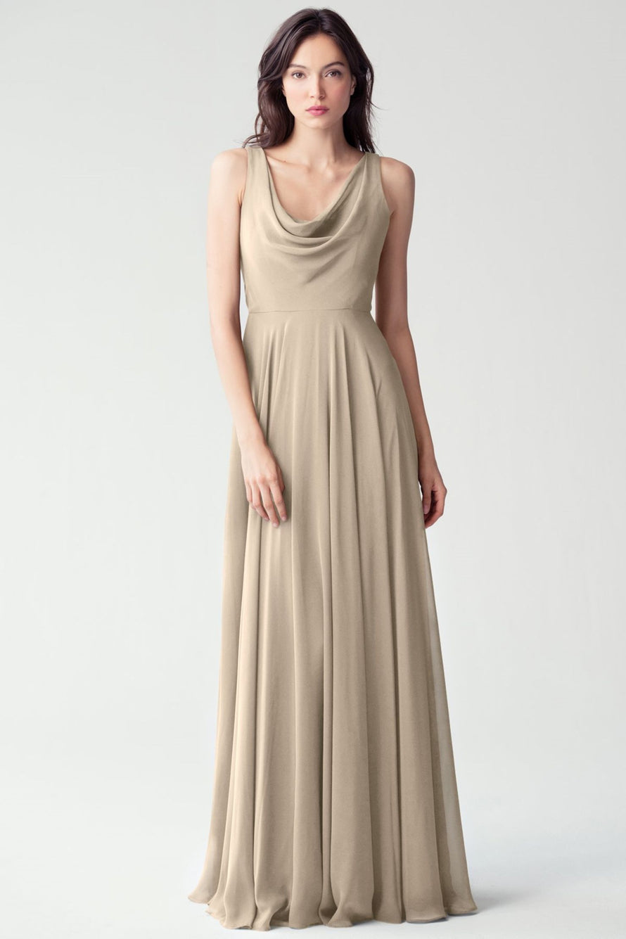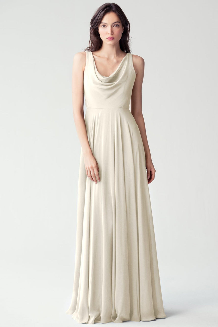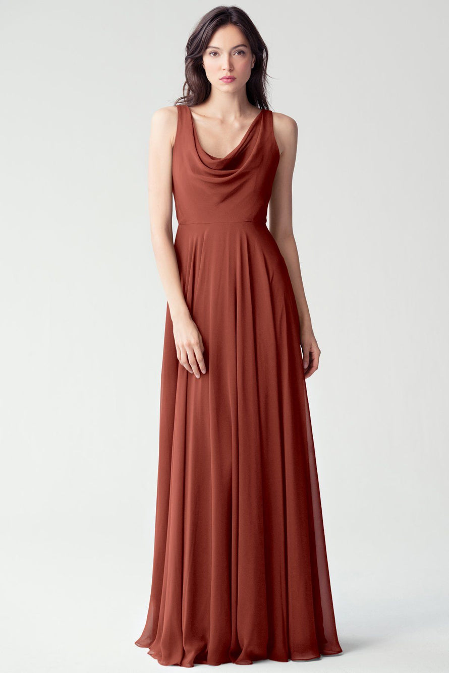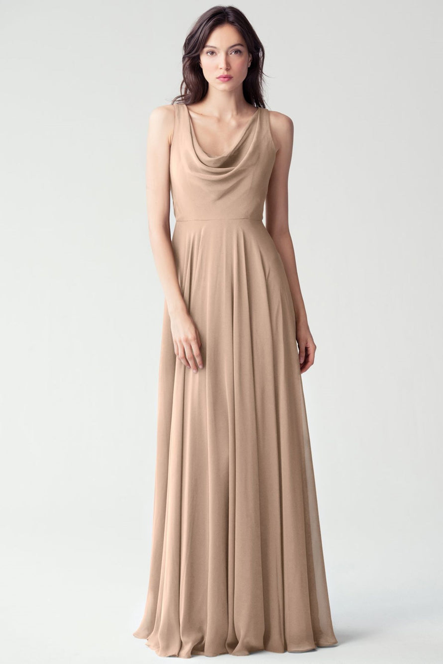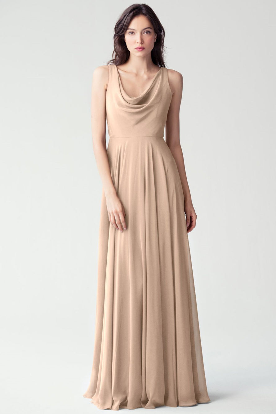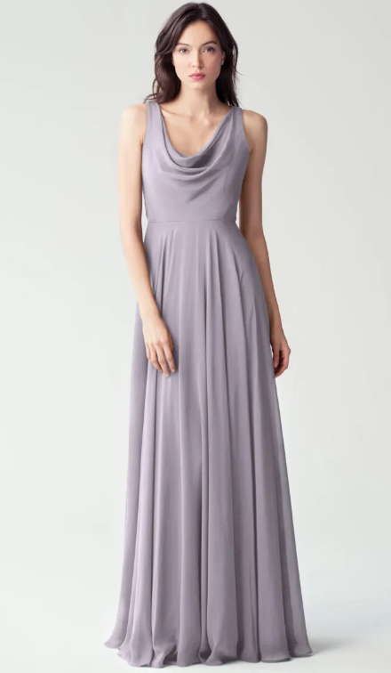 The Liana chiffon bridesmaid dress with its elegant cowl neckline and wide, comfortable straps provides coverage while creating a sophisticated silhouette. The form-fitting bodice is balanced by the full circle skirt. This dress combines comfort and style, making it a chic and versatile choice for various occasions.