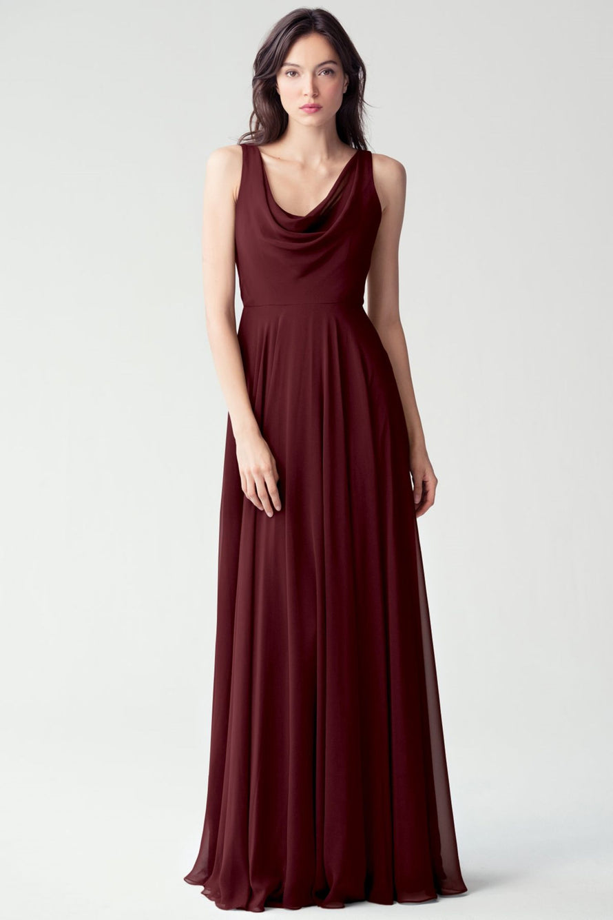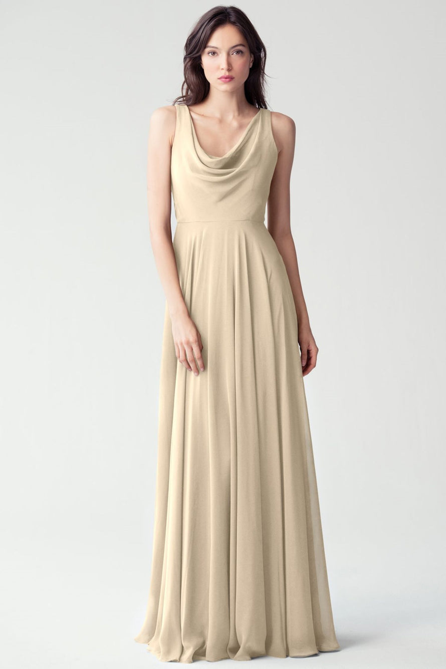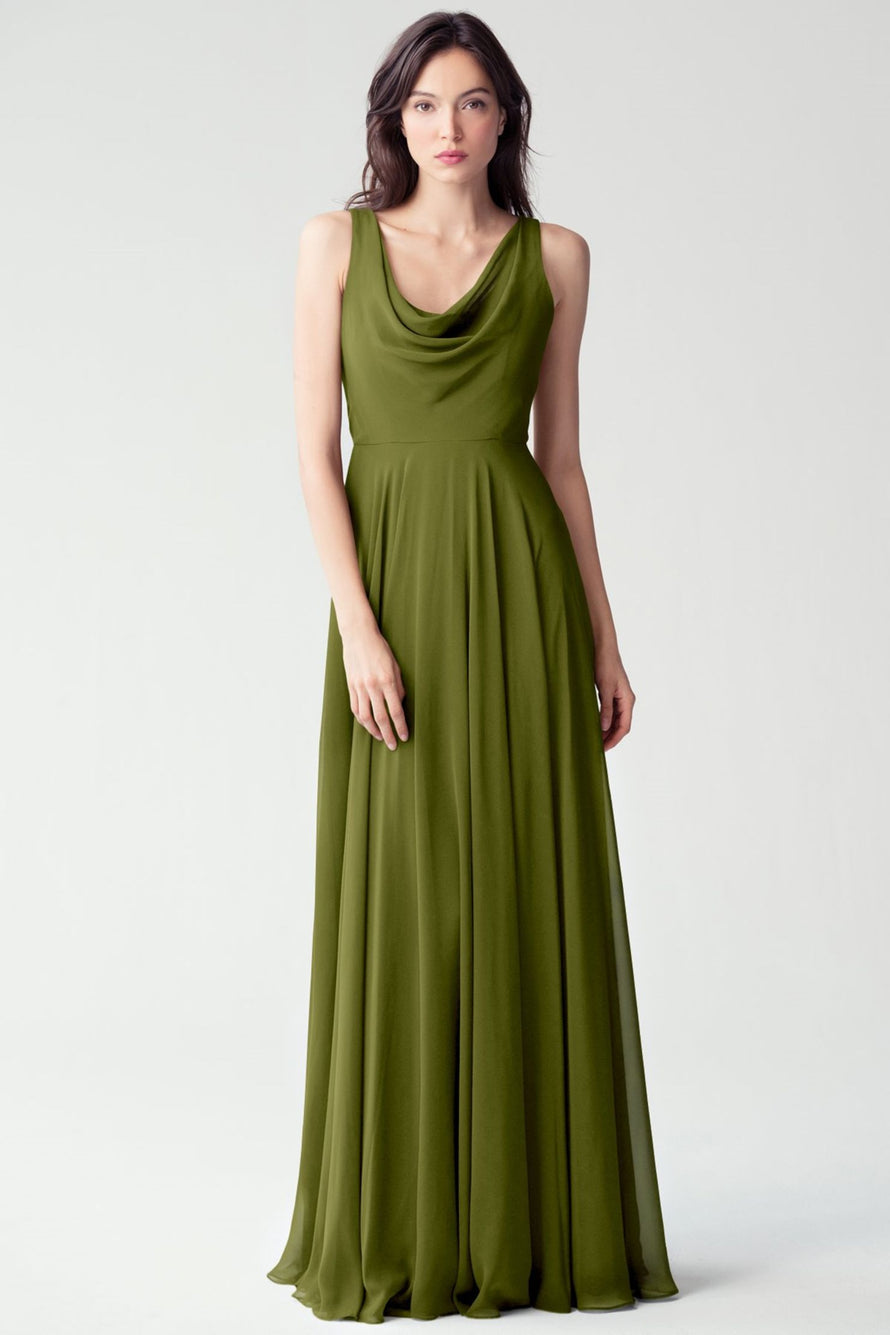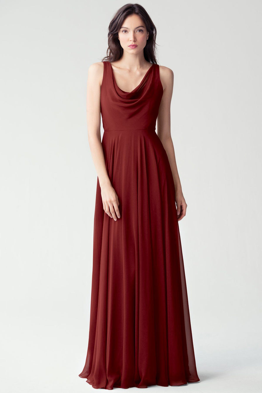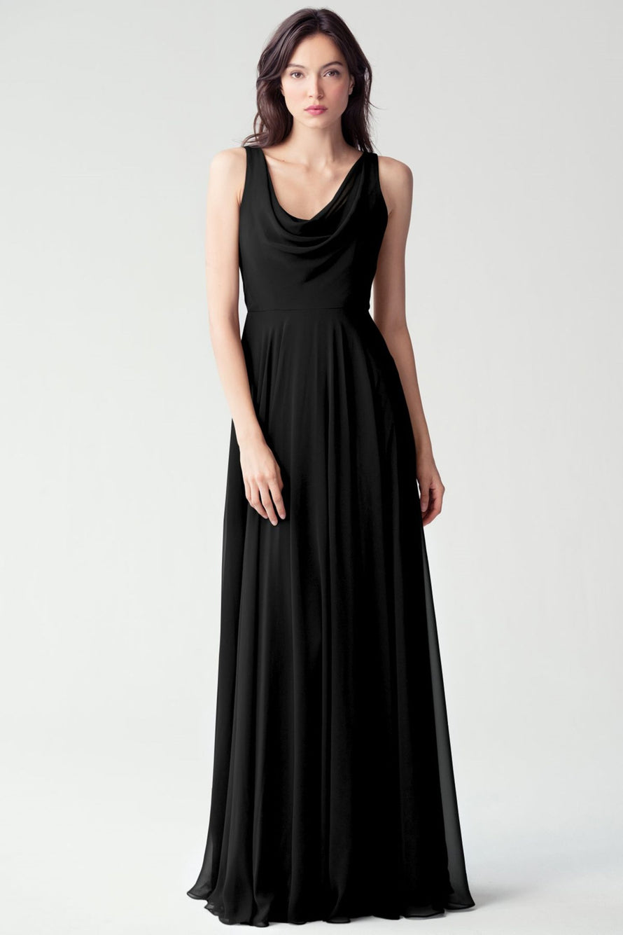 The Liana chiffon bridesmaid dress with its elegant cowl neckline and wide, comfortable straps provides coverage while creating a sophisticated silhouette. The form-fitting bodice is balanced by the full circle skirt. This dress combines comfort and style, making it a chic and versatile choice for various occasions.
