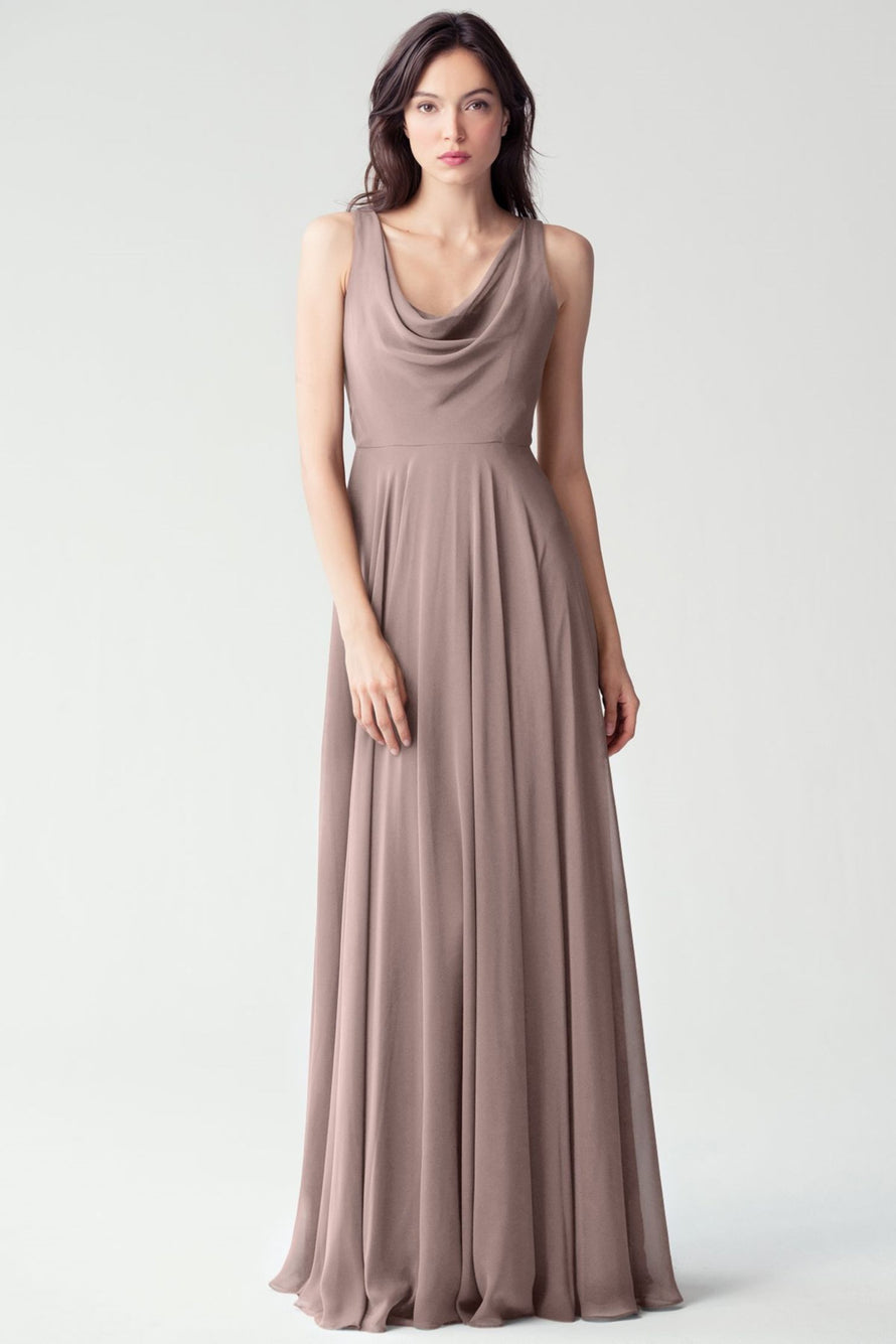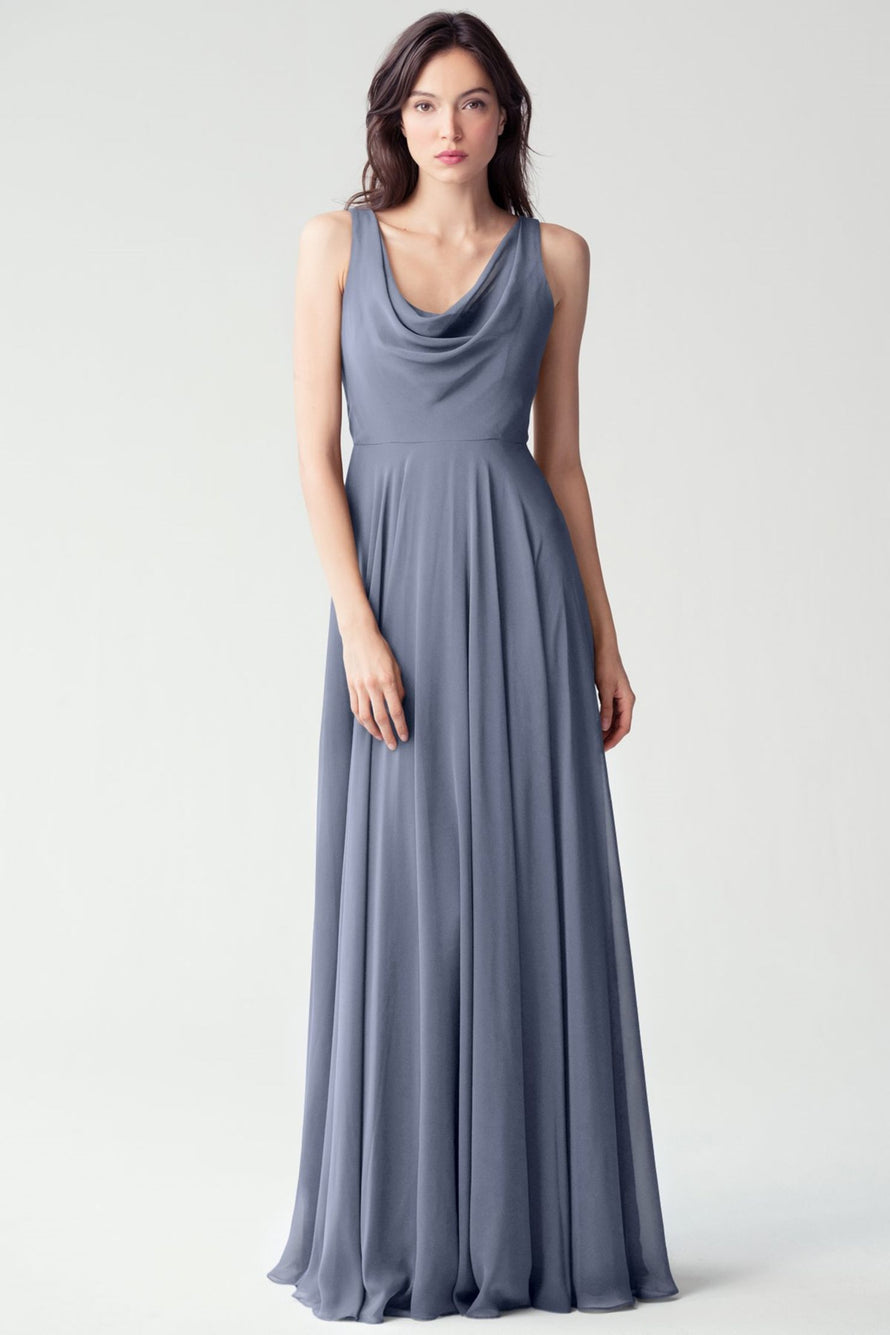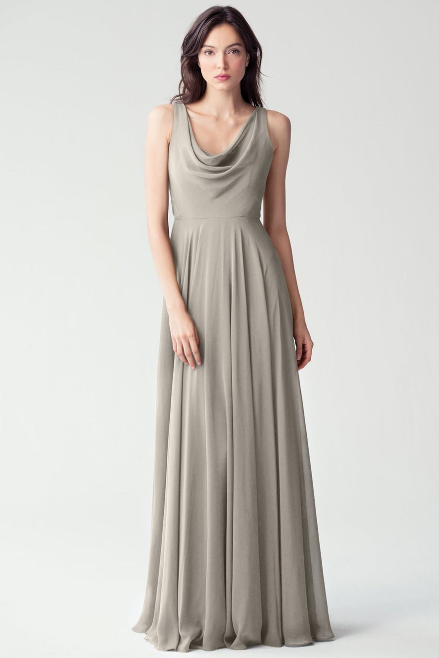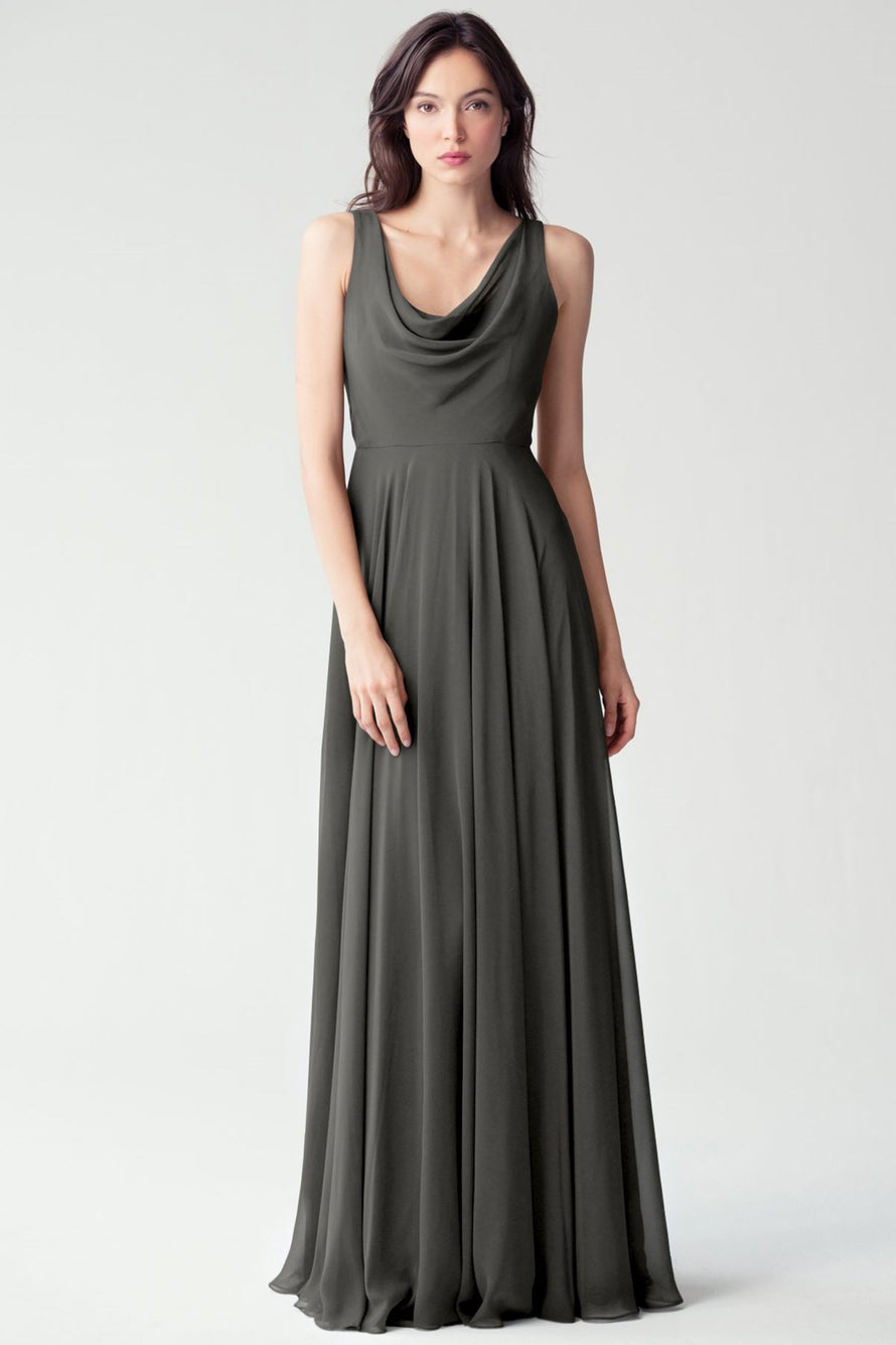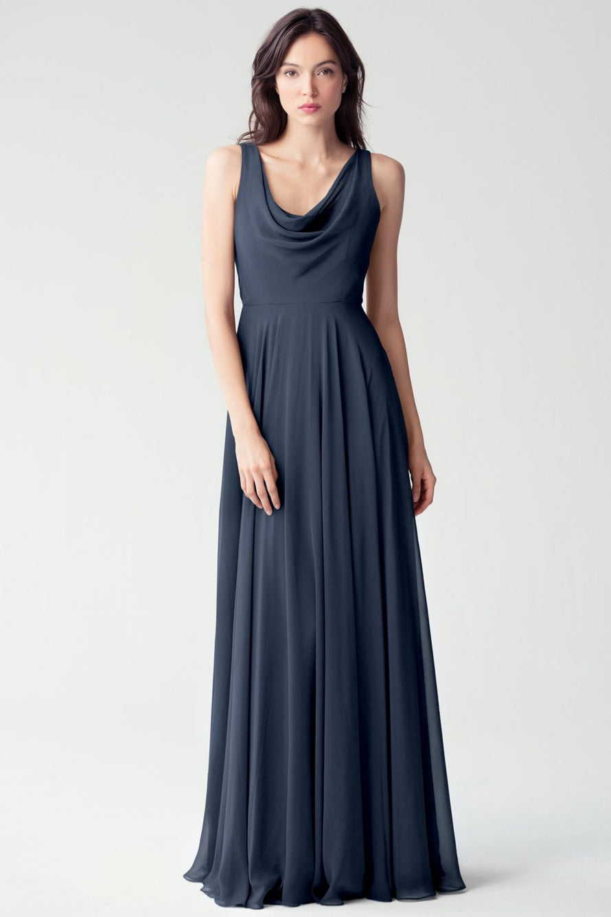 The Liana chiffon bridesmaid dress with its elegant cowl neckline and wide, comfortable straps provides coverage while creating a sophisticated silhouette. The form-fitting bodice is balanced by the full circle skirt. This dress combines comfort and style, making it a chic and versatile choice for various occasions.