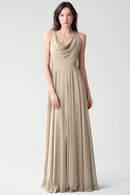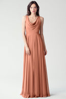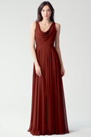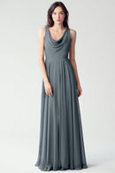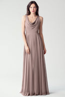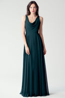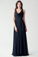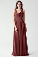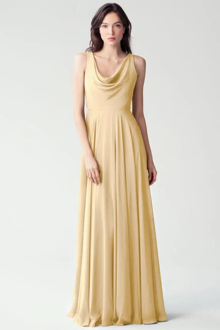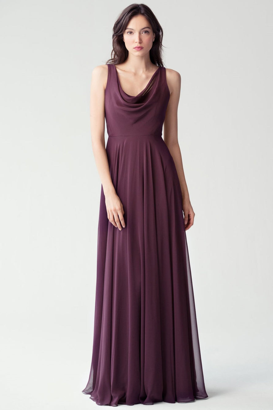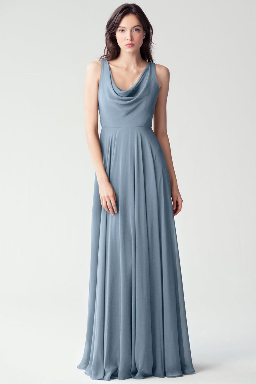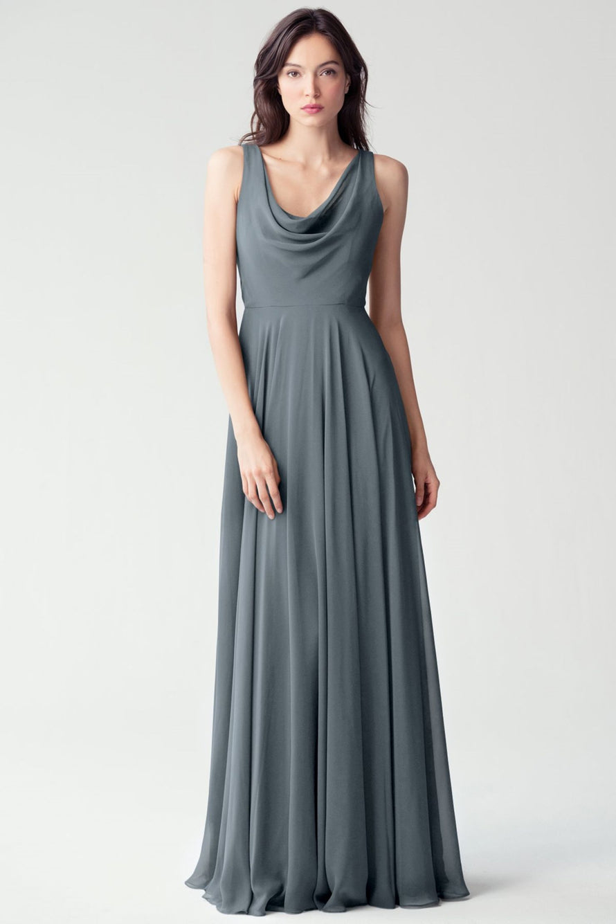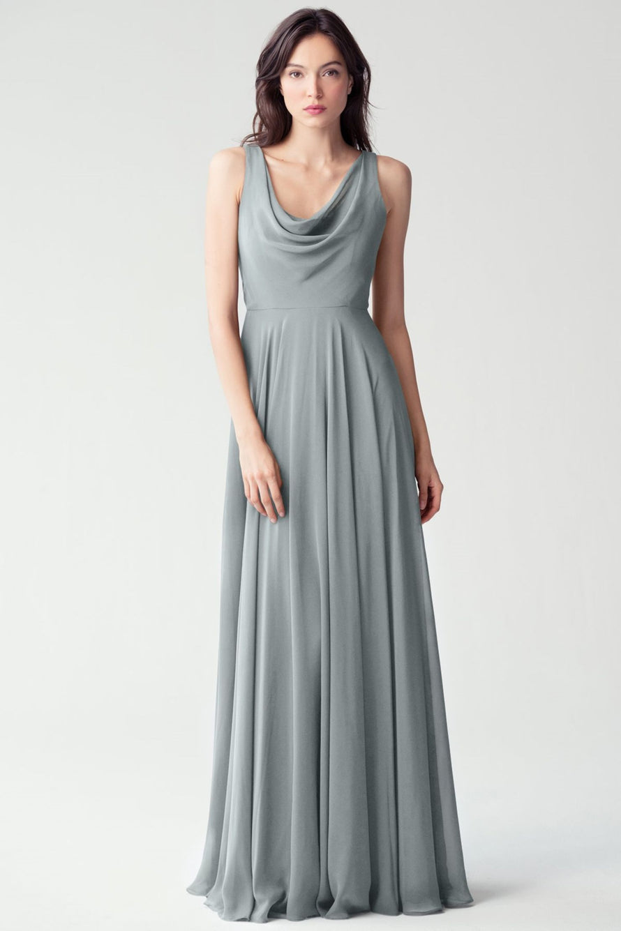 The Liana chiffon bridesmaid dress with its elegant cowl neckline and wide, comfortable straps provides coverage while creating a sophisticated silhouette. The form-fitting bodice is balanced by the full circle skirt. This dress combines comfort and style, making it a chic and versatile choice for various occasions.