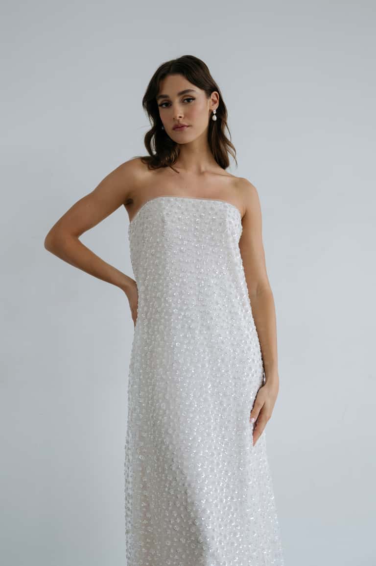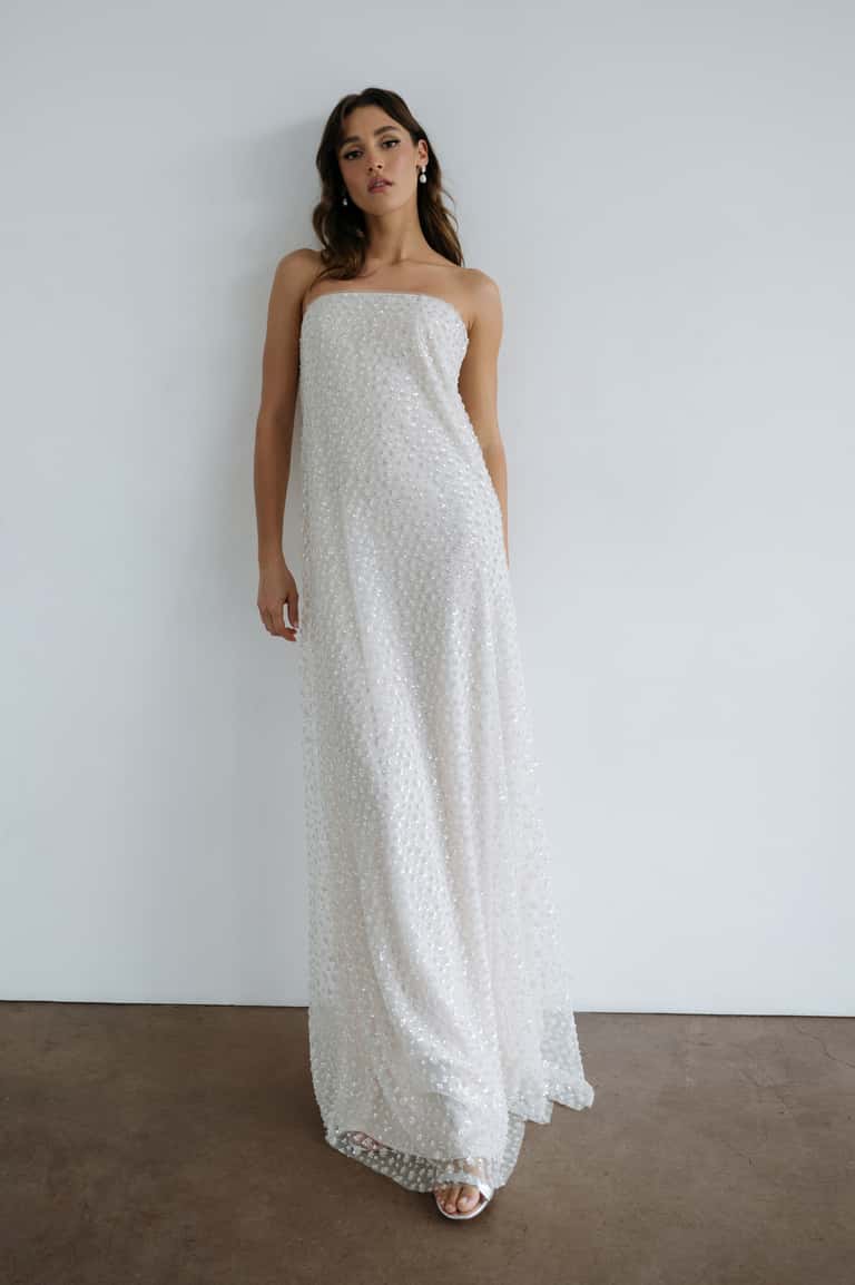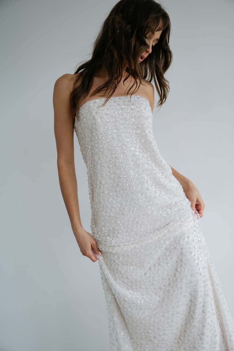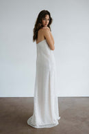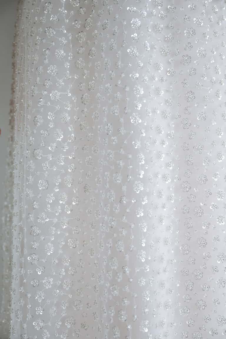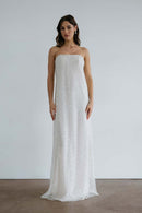 The Aarons dress, in our sheer Floral Deco sequin fabric floats over your body, and the built in hidden corset for a look that is as effortless as it is striking.