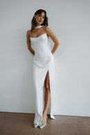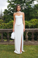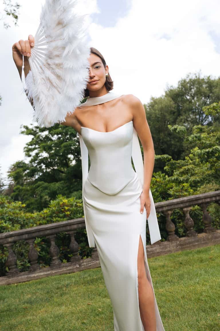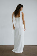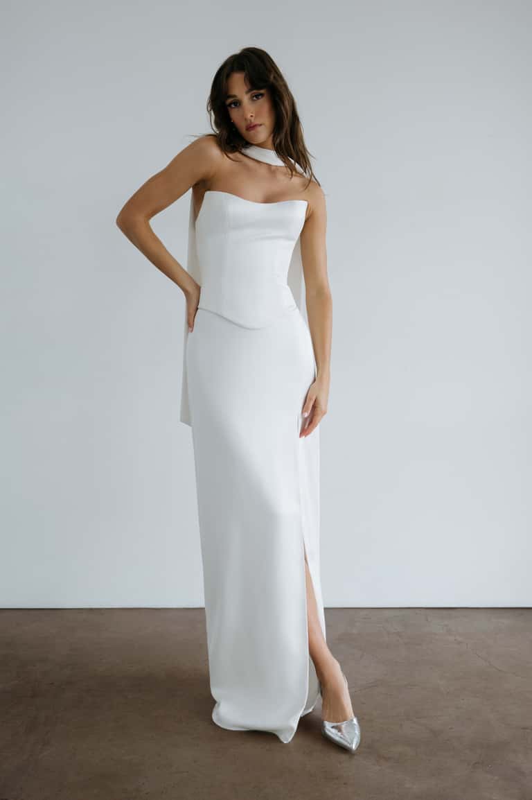 The Madison set is entirely of the moment, while remaining timeless. A structured corset bodice sits atop a chic column skirt with an alluring slit. The included scarf adds a touch of cinematic drama.