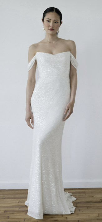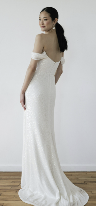 Introducing the Opal Little White Dress: a stunning ensemble featuring white striped sequins that shimmer with every movement. The sweetheart neckline boasts subtle peaks, while the strapless design offers the option of convertible off-the-shoulder straps for versatility. With its slim A-line silhouette and elegant train, this dress exudes timeless charm and modern allure. Available in sizes 00-32