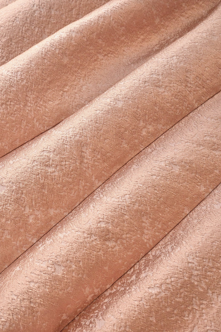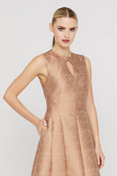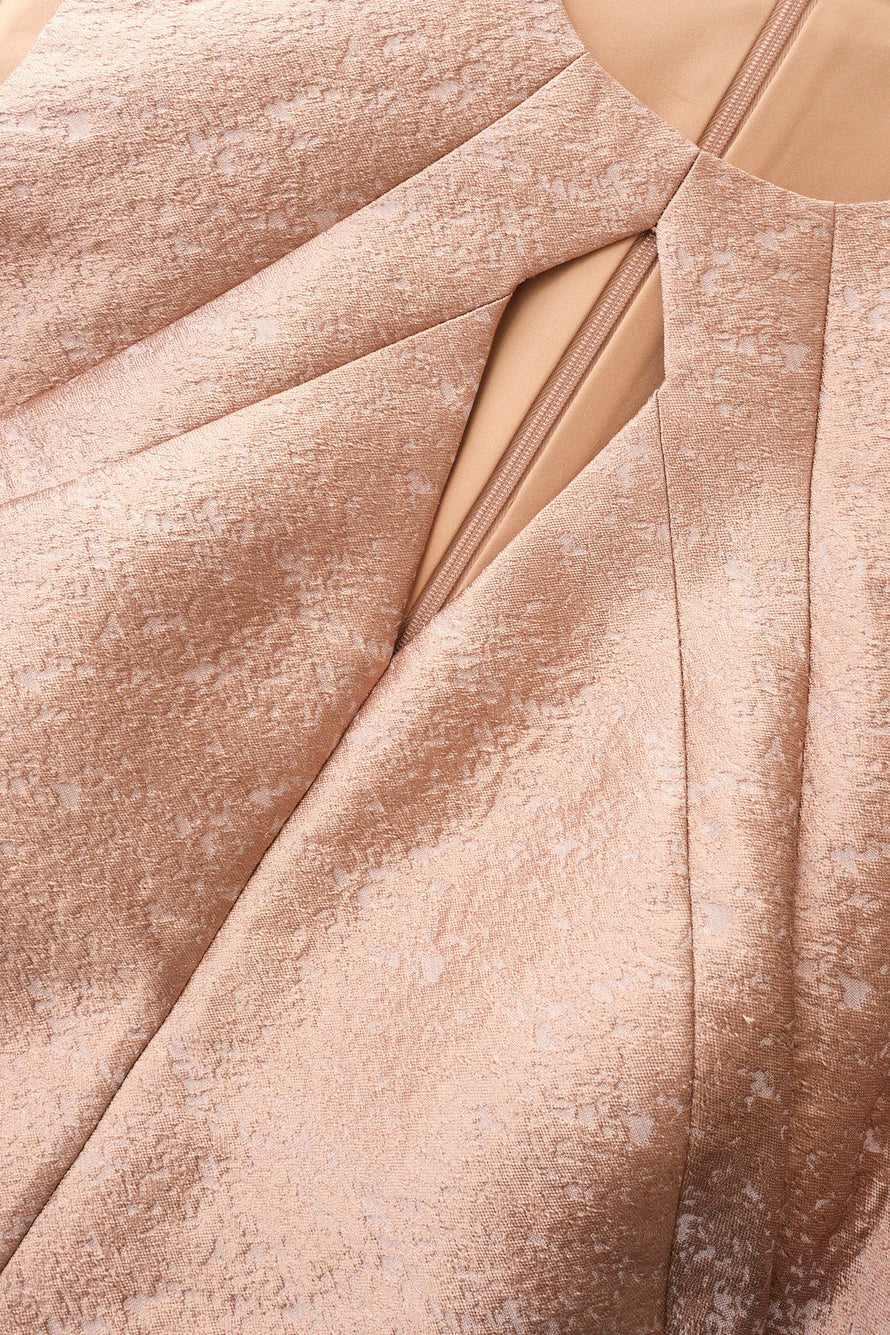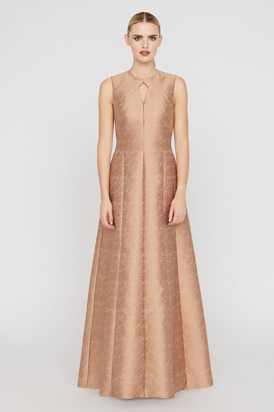 Crafted from textured jacquard, this soft gold gown features a sculpted bodice with a keyhole detail and soft flares through the skirt—perfect for formal celebrations or evening receptions.